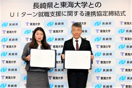 東海大学では11月1日に、長崎県とUIターン就職支援に関する連携協定を締結しました。この協定は、長崎県の次世代を担う産業人材の育成・確保を図ることなどを目的に、学内での就職イベント開催や同県出身学生を中心に県内企業の情報提供などで連携して取り組む計画です。本学ではこれまで30の道府県、市と就職支援に関する協定を締結しており、関連する都道府県との協定は今回が31例目となります。本学が各県と連携・協力することで、学生・保護者に対して各地で開催される就職説明会のスケジュールや、幅広い分野の企業が実施するインターンシップに関する情報提供が可能となるほか、本学における就職支援体制のよりいっそうの充実を図ると共に、各地の企業が持つ魅力や生活環境といった魅力を学生に直接アピールする機会を多く設けています。