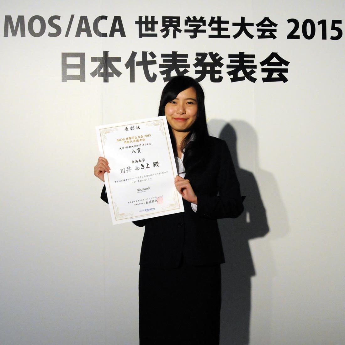 生物学部生物学科4年次生の川井あきよさんがこのほど、「MOS世界学生大会2015日本大会」の大学・短期大学部門のエクセル部門で入賞。6月12日に東京国際フォーラムで開催された表彰式に出席しました。「MOS(Microsoft Office Specialist/マイクロソフト オフィス スペシャリスト)」は、マイクロソフト社のワード、エクセル、パワーポイントといったアプリケーションソフトの実技試験によってそのスキルを証明するもので、同社が140をこえる国と地域で実施している世界共通の国際資格です。