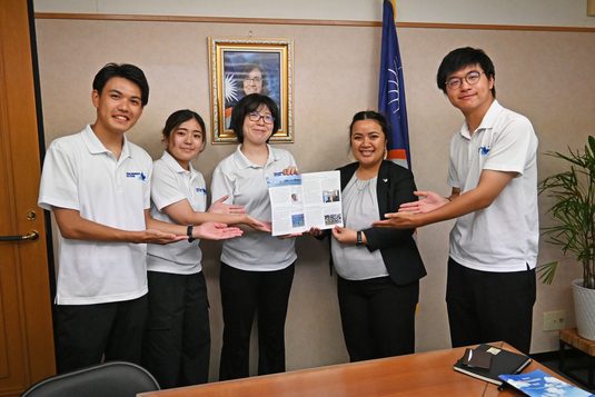 当日は、報告書作成に携わった澤田衆樹さん(大学院工学研究科2年次生)と井野日和さん(大学院工学研究科1年次生)、大庭由依菜さん(情報理工学部3年次生)、佐藤寛之さん(海洋学部2年次生)の4名と、工学部の笹川昇教授(第53回海外研修航海副団長)と体育学部・総合教育センターのデビット ウェイン デビッド講師(同研修航海団役員)が大使館を訪問。井野さんがリサ ラジカム ケース首席公使らに報告書を手渡しした後、プロジェクトメンバーそれぞれが、現地で学んだ文化や印象に残っている体験、現地学生との学術シンポジウムの様子を英語で報告しました。