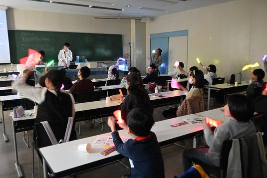 市内の小学4年生から6年生までの児童約60名が参加し、まず、岡田教授が「ふしぎなコップ、教訓茶碗を作ろう‼」を披露しました。教訓茶碗は、一定以上の水をコップに注いでしまうと、底から水が流れ出てしまう石垣島の民芸品で、当日は紙コップやストロー、輪ゴムなどを子どもたち一人ひとりに配って仕組みを再現。原理となっている「サイフォン効果」についても説明しました。続いてサイエンスコミュニケーターの学生が登壇し、2つ以上の物質を混ぜ合わせて光らせること「化学発光」を紹介。ルミノールと過酸化水素水、鉄を混ぜて発光させる実験ショーや化学発光の原理を利用した「ケミカルライト」を光らせ、子どもたちは一つひとつの実験を食い入るように見つめていました。そのほかにも、紙コップを用いた実験工作で、回転による空気の流れで軌道が変わる「マグヌス効果」について紹介。参加した子どもたちは、「普段の理科の授業より面白かった」「去年も参加して楽しかった。今回も優しく教えてもらえてうれしい」と笑顔を見せていました。