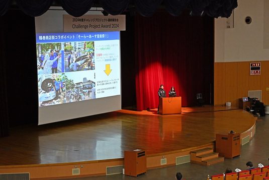 午前中には湘南キャンパスに集った全プロジェクトの代表者が写真や動画、図表をまとめたパワーポイントを活用し、イベントや大会などに参加する中で得られた成果、課題、今後の目標などを発表しました。各プロジェクトの学生や審査員がプレゼンテーションの内容を審査して、午後の「Challenge Project Award2024」に5プロジェクトが進出。特別枠でユニークプロジェクト「紡ぎで紡ぐ羊!!プロジェクト」も登壇しました。また、審査員には全国のカレッジオフィス課長のほか、東海大学連合後援会の二重作昌明会長や、秦野市・伊勢原市・平塚市の職員、自然電力株式会社の特務であり、合同会社わびさびの共同代表も務める石井祐介氏も加わった約10名で、各プロジェクトの発表を審査。その後の表彰式では、優勝に「東海大学ソーラーカーチーム(湘南)」、準優勝に「Global Innovation Project(湘南)」が選ばれ、CLCの内田匡輔所長が表彰状を手渡しました。