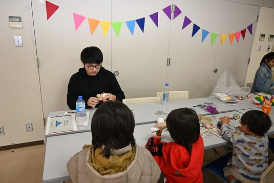 さまざまな国にルーツを持つ多くの子どもたちや家族連れが訪問する中、日本人の保護者は、「普段は家でゲームばかりしているので、このような昔ながらの遊びを楽しむとてもよい機会になりました」と話していました。子どもたちに「けん玉」を教えていたチョウ・カホウさん(工学部3年次生)は、「日ごろから学内でもさまざまな国からの留学生と交流していますが、今日は子どもたちと触れ合う貴重な経験ができました」とコメント。プロジェクトリーダーの佐藤亮太さん(文学部3年次生)は、「多様な国にルーツを持つ多くの子どもたちが一緒に遊べるような企画を考えました。地域の外国人の皆さんにもおもちゃを通して日本の文化に触れてもらえたと思います」と話していました。