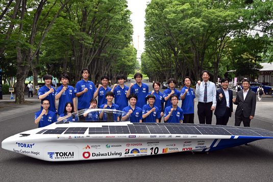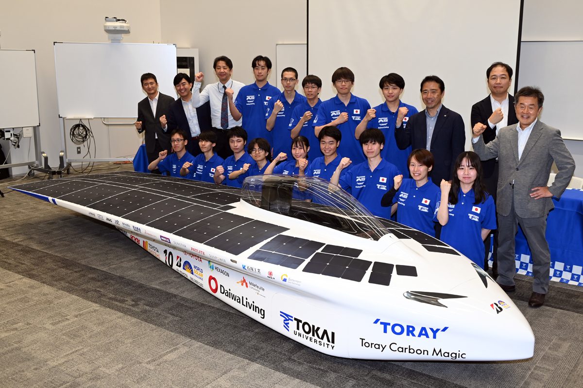 キャンパスライフセンター・ToCoチャレの「東海大学ソーラーカーチーム」が、今年8月にオーストラリアで開催される世界最大級のソーラーカーレース「Bridgestone World Solar Challenge 2025(BWSC)」出場に向け、6月16日に湘南キャンパスで参戦体制発表会を開催しました。ソーラーカーチームは、オーストラリア北部のダーウィンから南部のアデレードまで約3000kmのコースで2年に1度開催されるBWSCで、2009年と11年の大会で連覇を果たし、19年は僅差で準優勝するなど好成績を残してきました。23年に開かれた前回大会では、日本チームトップの5位になっています。チームは、世界一奪還を目指す今大会に向けて、東レ株式会社や東レ・カーボンマジック株式会社など、国内外の多くの企業から支援を受け新型マシン「2025年型 Tokai Challenger」の開発を進めてきました。また、大会タイトルスポンサーである株式会社ブリヂストンが供給するソーラーカー専用タイヤの開発にも走行試験データーの提供などで協力してきました。