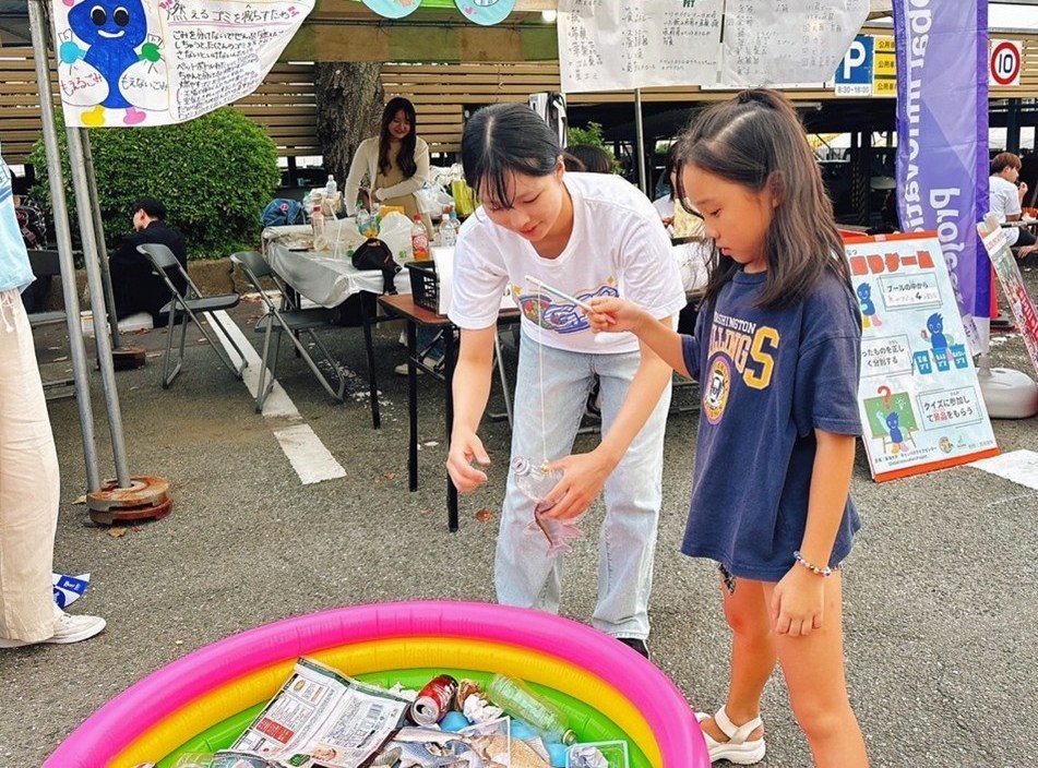 今回のイベントは、秦野市の子どもたちに身近な環境問題やごみ分別について意識を持つきっかけにしてもらおうと、1年次生のメンバーが中心となって企画を立案しました。当日は、磁石をつけた空き缶やペットボトル、秦野市に生息する魚のイラストをビニールプール内に設置。参加者が先端に磁石が付いた竿でごみや魚のイラストを釣り上げ、「魚」「燃えるごみ」「プラスチック」「資源ごみ(缶、ペットボトル)」の箱に仕分けました。さらに、SDGsに関するクイズを出題するなど、参加者にごみ分別の重要性を伝えました。