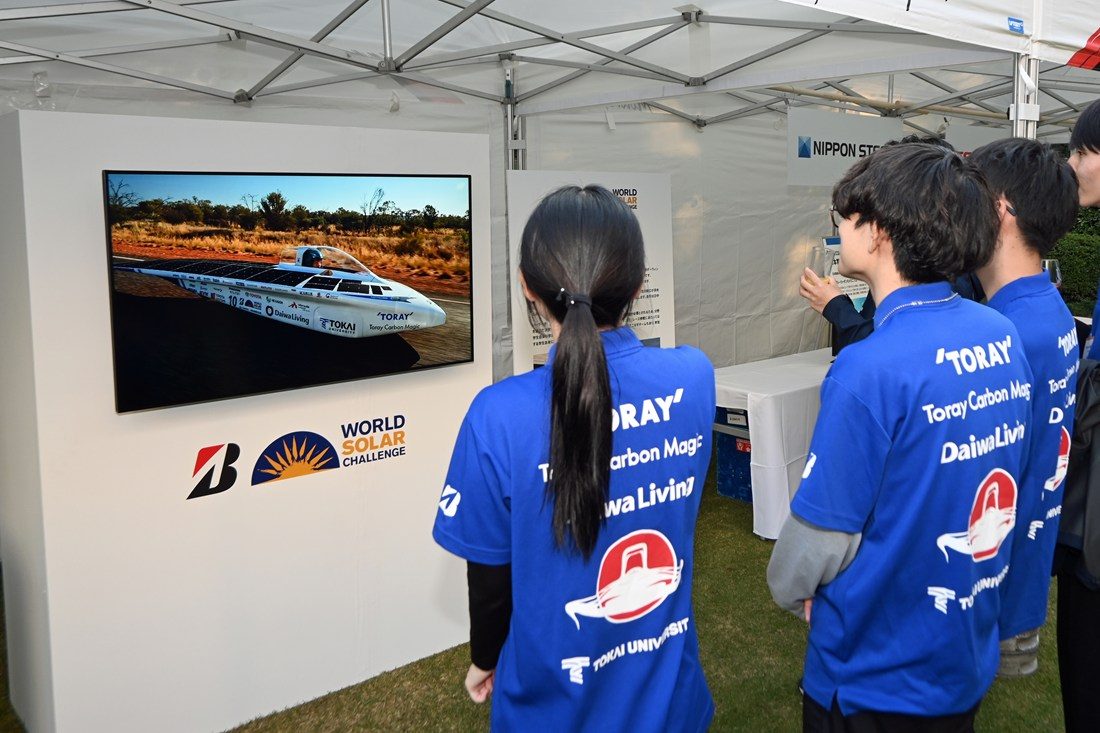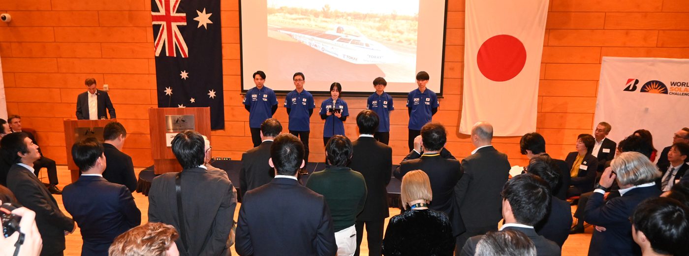 ToCoチャレ「東海大学ソーラーカーチーム」が、11月20日に東京都・在日オーストラリア大使館で開かれた「2025 Bridgestone World Solar Challenge (BWSC) Partners Reception」に出席しました。同大使館と大会冠スポンサーの株式会社ブリヂストンによるこの催しは、8月にオーストラリアで開催された世界最高峰のソーラーカーレース「2025 BWSC」の成功を祝うとともに、BWSCやモータースポーツを起点とした持続可能な社会の実現に向けた活動を広く発信することを目的としたものです。ソーラーカーチームは今年8月の大会で、世界5位、アジア太平洋地域1位の順位でゴールしました。