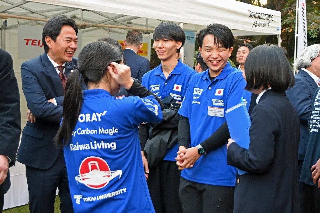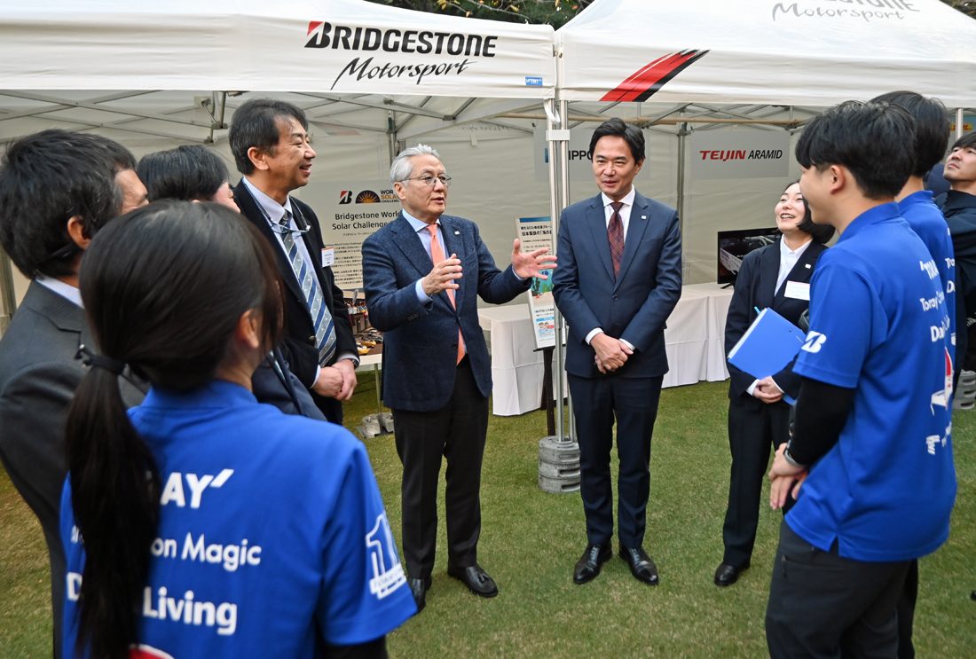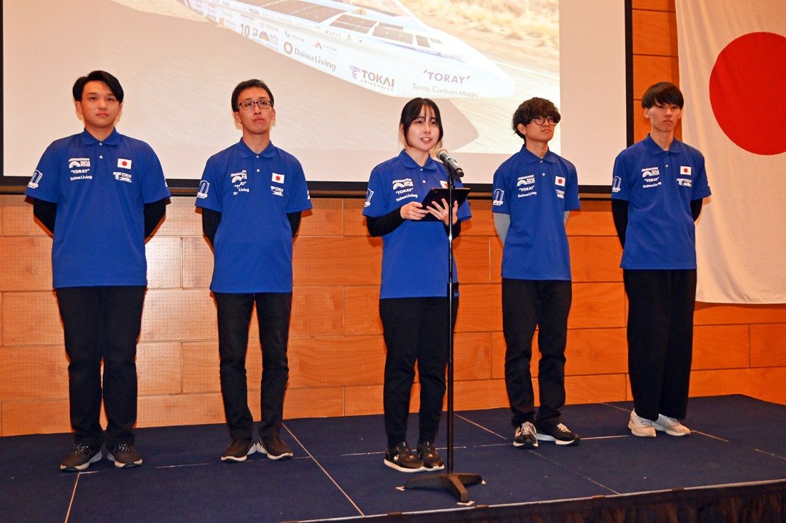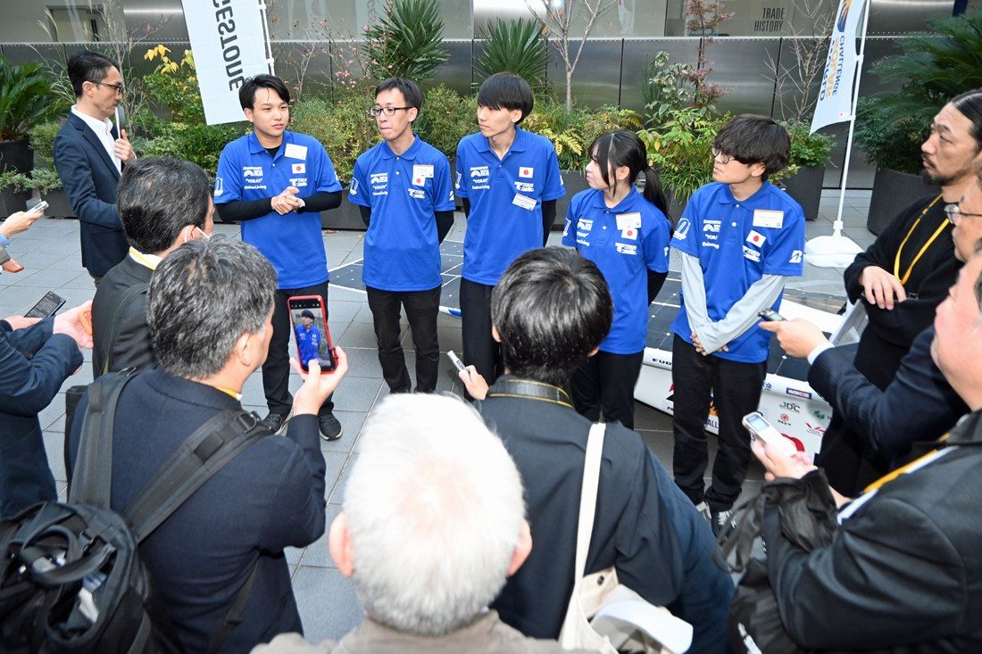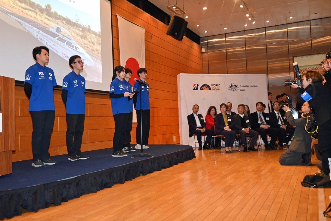 初めに、駐日オーストラリア大使のジャスティン・ヘイハースト閣下とブリヂストン代表執行役グローバルCEOの石橋秀一氏があいさつ。その後、各出場チームのメンバーが登壇し、レースで得た経験や学びをスピーチしました。本学からは鬼頭さんが、「限られた太陽エネルギーを活用するレースを通して、サステナビリティとは“限られた資源で世界をよりよくする努力”を指すと実感しました。チームとして目標に掲げた大会優勝はなりませんでしたが、同じ志を持つ世界中のチームと競り合い、太陽の力だけでオーストラリアの3000kmの大地を走り抜けたことは、BWSCでしか得られないかけがえのない経験です」と英語でスピーチしました。また、チームはメディアからの囲み取材にも対応したほか、ブリヂストンの石橋氏、同社副社長の森田泰博氏らから激励を受けました。