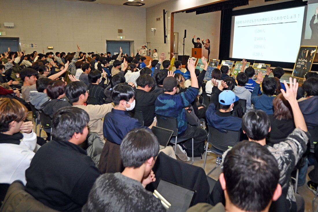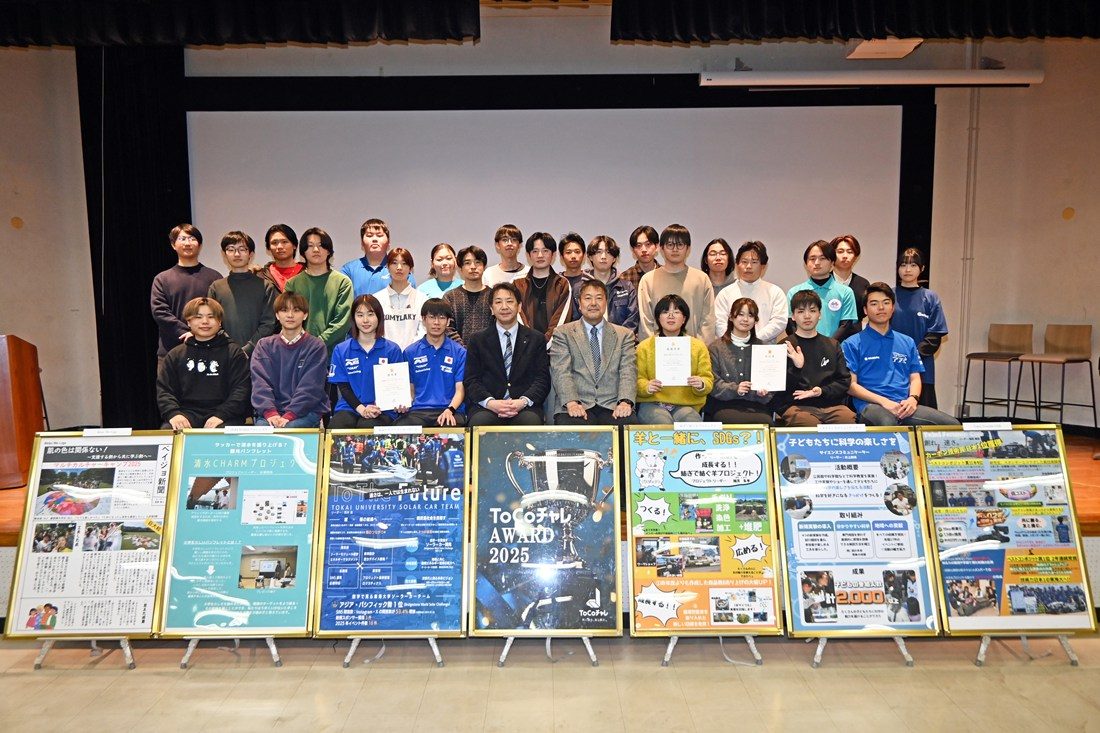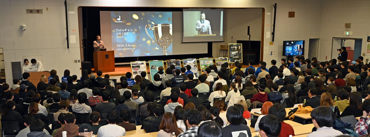 キャンパスライフセンター(CLC)では2月6日に、湘南キャンパスで「 ToCoチャレ AWARD 2025」を実施しました。ToCoチャレに参加する学生たちが、1年間のプロジェクト活動を通して見つけた自分たちならではの魅力や面白さを発信し、成果を自慢し合える場をつくることで、プロジェクトの良さを再発見してもらうことが目的です。また、その取り組みを学内外へ広く共有し、次年度以降の参加意欲を高め、プロジェクトへの理解を深めていく狙いです。湘南キャンパスを拠点にオンラインも併用し、静岡、熊本、札幌の各キャンパスに配信しました。