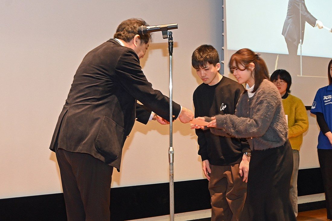 ToCoチャレ AWARDの審査では、湘南キャンパスで活動する「サイエンスコミュニケーター」が奨励賞、「東海大学ソーラーカーチーム」が優秀賞、阿蘇くまもと臨空キャンパスで活動する「紡ぎで紡ぐ羊プロジェクト」が最優秀賞に選出され、木村学長から表彰状が手渡されました。木村学長は講評で、「ToCoチャレでは、座学では得られない人間力の向上と、多様な人々との関わりを持つことができます。私も昨年4月の学長就任以来、チャレンジする学生を応援する大学でありたいと言い続けてきました。挑戦を続ける皆さんを誇りに思っています」と語りました。