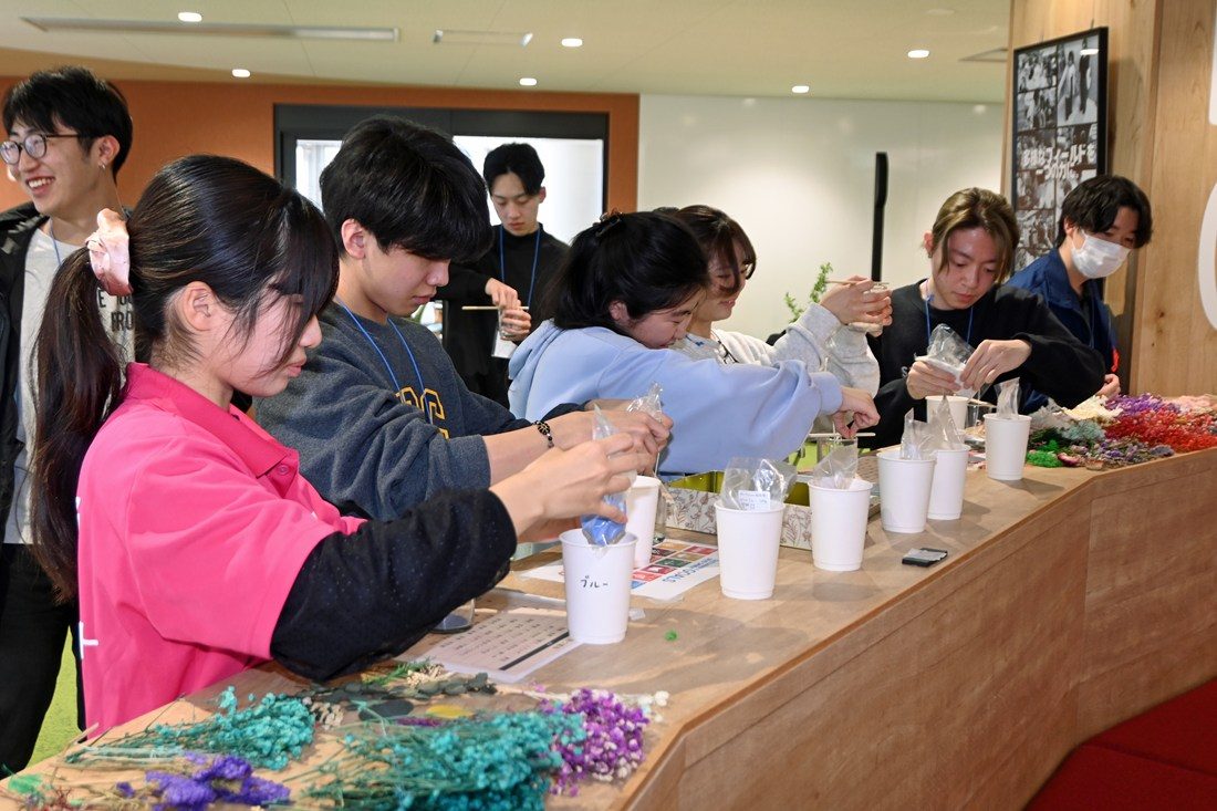 初めのあいさつに立ったCLCの内田匡輔所長(体育学部教授)は、「長いようで短いキャンパスライフでプロジェクト活動を通して学び、自分の変化を感じてほしい。研修会の時間を有意義に過ごしてください」と話しました。続けてCLCの職員が、ToCoチャレの概要や新リーダーへの期待について語りました。期間中、学生たちは4、5人のグループに分かれて2つの研修に臨み、初日のキャンドル制作ワークショップでは、ロゴステッカーや日ごろの活動で使用している部品、カラーサンドを使い、プロジェクトをイメージした作品を制作。作品には、プロジェクト活動への熱意や大切にしたい価値観などを込めました。2日目の研修では、日本の昔遊び体験ワークショップを開催することを想定し、グループごとに企画内容を検討。湘南キャンパスの各チームが提出する「プロジェクト活動許可願」を参考に、企画の達成目標や期待される効果などについて話し合い、企画立案に必要なスキルについて学びを深めました。さらに、日ごろミーティングを円滑に行うために行っている工夫などについても共有しました。