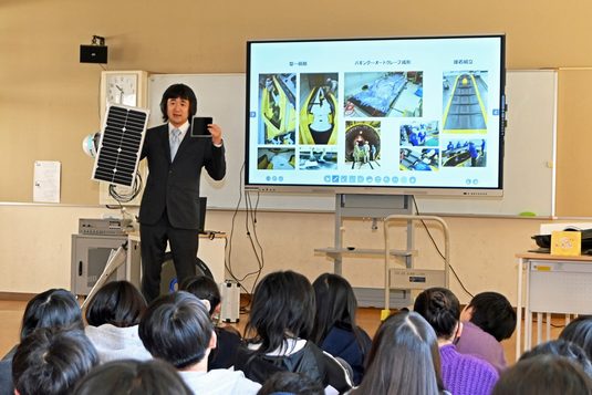 ToCoチャレ「東海大学ソーラーカーチーム」が、3月12日に愛川町立中津第二小学校で出前授業を行いました。同小学校からチームに依頼があり初めて実施したもの。ソーラーカーを通じて環境や科学技術に興味を持ってもらおうと、佐川耕平総監督(工学部准教授)と10名のプロジェクトメンバーが同校を訪問しました。