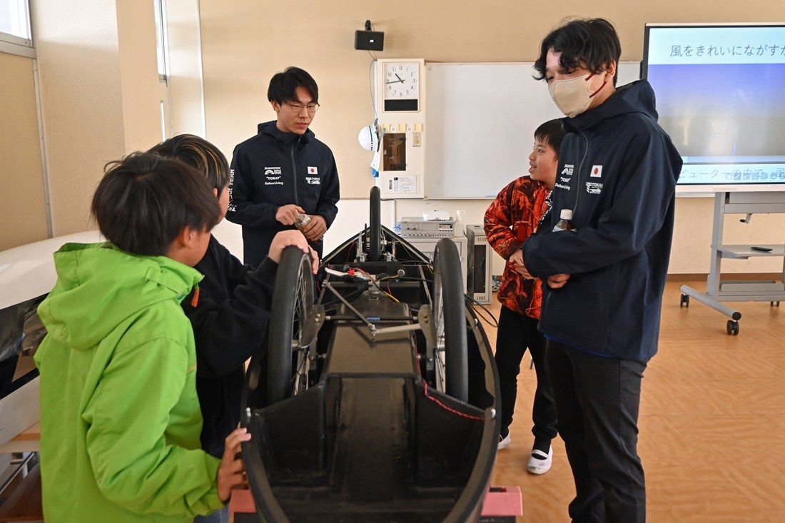 参加した児童は、「ソーラーカーの実物を初めて見ました。想像していたよりも大きくて、走る時の音は静かで驚きました」「運転をしていた大学生がかっこよかった」と話していました。プロジェクトの広報を担当する細田さくらさん(工学部2年次生)は、「子どもたちがたくさん質問する様子から、ソーラーカーに興味を持ってくれたことが伝わってきてとてもうれしかったです」と笑顔を見せていました。佐川総監督は、「学生たちは、目を輝かせてソーラーカーを見る小学生の姿を通して、技術の重要性やプロジェクト活動への誇りを改めて感じたのではないかと思います。参加していないメンバーにも今回の経験を共有し、今後の活動へのさらなる意欲につなげてほしい」と語っていました。
