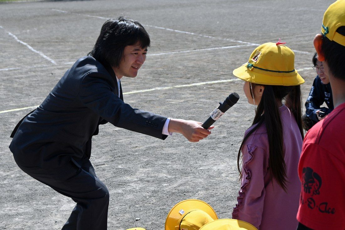 当日は初めに佐川総監督が、小学5年生約50名を対象に教室内で講義を実施。太陽光を電気に変化させて走行するソーラーカーの特徴に触れ、「ガソリンを給油する必要がなく、太陽光が出ている限り走り続けられて、二酸化炭素も発生しないので、『究極のエコカー』と呼ばれています」と紹介。軽い炭素繊維を使用するボディや株式会社ブリヂストンと共に開発したソーラーカー専用タイヤといったマシン全体について解説したほか、チームが世界一を目指して出場してきた世界最大級のソーラーカー大会「ブリヂストン・ワールド・ソーラーチャレンジ」を紹介しました。その後は、校庭で「2019年型 Tokai Challenger」のデモ走行を披露。他学年の児童や近隣の保育園児ら約350名が見守る中、学生ドライバーの小平苑子さん(大学院工学研究科1年次生)と二ノ宮孝仁さん(情報理工学部4年次生)がステアリングを握りました。マシンの走行に見入った子どもたちからは、「どうしてタイヤが小さいんですか?」「マシンを完成させるまでにどのくらいの時間がかかりますか?」「飛行機のような形をしているのはなぜですか?」など多くの質問が寄せられ、佐川総監督が一つひとつ丁寧に回答しました。