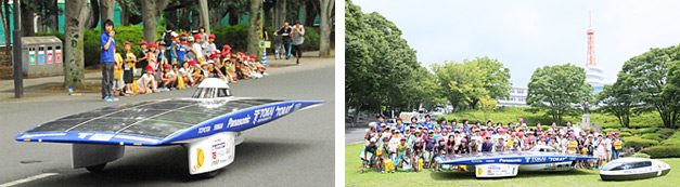 当 日は、屋外で実際にソーラーカーと電気自動車を見せながら「なぜ車体がこのような形になったのか」「このソーラーカーにはどれだけの発電能力があるのか」 などの説明をした後、構内にある中央通りでソーラーカーと電気自動車のデモ走行を行いました。走行後は1号館の教室に移動し、メンバーの塚越繁之さん(工 学部2年次生)横井泰之さん(同1年次生)が電気自動車とソーラーカーについて説明し、ソーラーカーチーム監督の木村英樹教授(同)が、地球温暖化などの 環境問題の観点からエコカーが今後どのように活躍していくかを、燃料電池車やガソリン車の燃費について触れながら説明しました。木村教授が、「最高速度は 何キロですか?」という児童からの質問に、「理論的には時速160kmまで出る」と答えたところ、「電気自動車やソーラーカーが速くて驚いた!」という感 想が聞かれました。