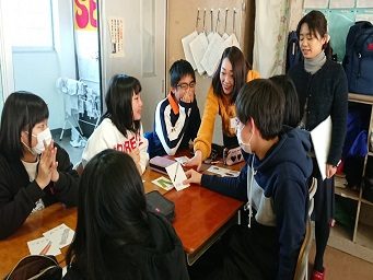 当日は大根中の2年生3クラス、約100名が参加。メンバー14名が各クラスに分かれて、防災クイズを実施し、熊本地震の被災地の様子を写真で紹介しました。防災クイズ「リアル防災ゲーム」では、生徒たちにはさみやテープ、金属バット、スリッパなどのイラストが書かれたカードを配布。「友達と一緒にいるときに地震が発生しました。家具が倒れてきて挟まってしまった友人を助け出すためには何を使う?」「避難所へと移動中に寒さで凍えたおばあさんを見つけました。温かくしてあげるには何を使う?」といった問題を出題。生徒たちは4名から5名のグループに分かれて答えを考え、選んだ道具をどのように使うのか発表していました。すべてのプログラムを終えるとメンバーたちは生徒たちに「くまふく防災プログラム修了証」を授与していました。