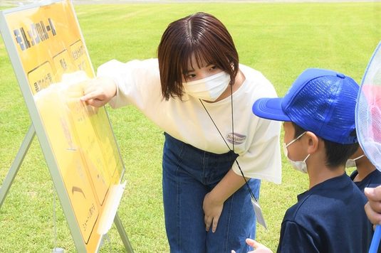 当日は、親子連れや卒業生らが多数訪れ、受付では検温や手指消毒などの新型コロナウイルス感染症対策を徹底。学生たちが丁寧にルールを説明したり、実演したりしながら交流を深めたほか、会場には竹を使ったフォトスポットも用意しました。リーダーの田中健翔さん(経営学部経営学科3年次生)は、「流しそばに使っていた竹を活用したイベントができないかとメンバーで話し合い、お笑いコンビ『さらば青春の光』の森田哲矢さんがモルックの日本代表として世界大会に出場するなど、近年日本でも注目を集めていることから今回の企画を考えました。子どもたちも楽しんでくれてよかった」とコメント。石橋玄さん(同)は、「テレビなどでモルックを見て興味があり、阿蘇の自然の中で子どもたちと一緒に楽しめたらいいのではと考え、メンバーに提案しました。先輩方が長年築いてきた南阿蘇の皆さんとのつながりや伝統を残したいと、引退した4年次生にも手伝ってもらいながら準備してきました。メンバーは県外出身学生が多いので、今後もまだ知られていない熊本の魅力を自分たちも体験しながら発信していきたい」と話していました。