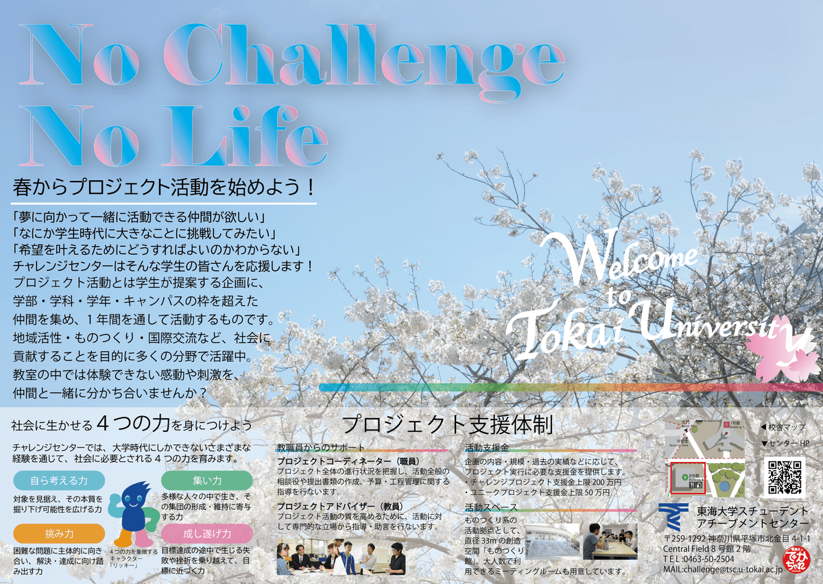 チャレンジセンターでは、入学式に合わせて湘南キャンパスで開催される課外活動団体の「新入生歓迎イベント おいでよとうかいの森」にて、下記の通りプロジェクトメンバー募集説明会を行います。