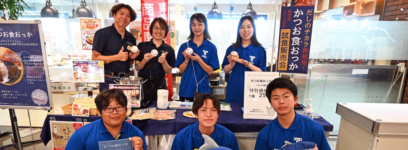 7月14日には静岡キャンパス内で初めて「かつお食おっか」を販売。約1時間の限定販売となりましたが、目標販売数の100個を大幅に超える反響となりました。翌15日には、静岡市清水区のエスパルスドリームプラザで一般販売も実施しました。学生とともにブースに立った西尾商店の西尾透雄代表取締役社長は、「カツオ特有の生臭さがなく、甘さの中にだしの風味が感じられる唯一無二の商品」と話しました。また、17日には駿河区のエネリアショールーム静岡で行われたプロバスケットボールチーム・ベルテックス静岡の応援イベントでも店頭販売しました。プロジェクトアドバイザーの清水宗茂准教授(海洋学部水産学科)は、「イベント内で実施された料理教室のデザートとしても試食いただき、ベルテックスの選手と家族連れのみなさまにも好評でした。自分たちのアイデアを商品化して実際に販売することは、学生にとって今後のキャリア設計も含めて非常にいい機会になっています」と語りました。