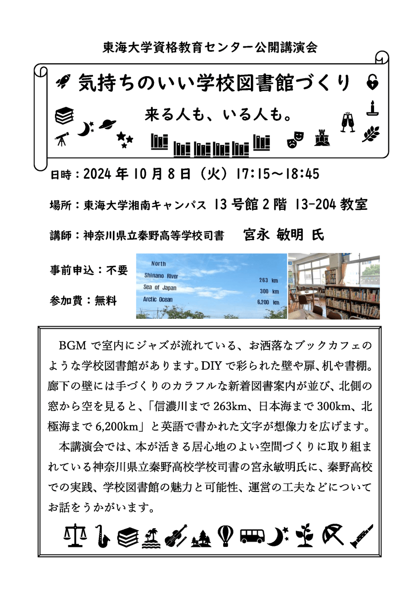 資格教育センターでは、2024年10月8日(火)17時15分より、公開講演会「気持ちのいい学校図書館づくり 来る人も、いる人も。」を開催します。