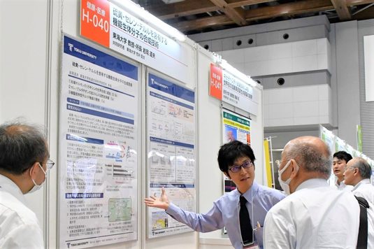「健康・医療」分野には、先進生命科学研究所の岩岡道夫所長(理学部化学科教授)が「硫黄・セレン・テルルを含有する機能生体分子の合成技術」をテーマに出展。共同で研究を進めている荒井堅太准教授(理学部化学科)と、子宮内膜症に対する抑制効果が報告されている妊娠ホルモン「リラキシン」などの物質を簡便な方法で高収率・高純度に化学合成する方法を紹介しました。医学部医学科の今井仁講師(総合診療学系健康管理学領域/総合医学研究所)は、「特殊な大腸菌を狙ったクローン病の新規治療法の開発」と題して発表。根治療法のない難病指定疾患・クローン病の原因となる接着性侵入性大腸菌「AIEC」に特異的に反応する抗体「IgA」を活用した、新たな診断・治療法の開発につながる成果を紹介しました。