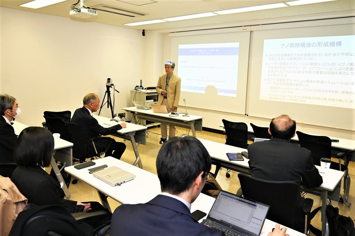 当日は、同研究会の堀内敏行委員長(東京電機大学教授)が開会の挨拶を述べ、草場光博先生(大阪産業大学教授)が座長を務める2部構成(招待講演・一般講演)で進められました。招待講演では、総科研の坂上仁志研究員(核融合科学研究所名誉教授)が「ナノ構造形成を解析するための3次元電磁粒子シミュレーション」と題して講演しました。レーザー照射された固体材料表面には、極微細な周期構造(ナノメートルの大きさの構造)が形成されます。その大きさはレーザー波長の1/25程度と極めて小さく、レーザーはその大きさを感じませんが、何故か固体材料表面に形成されます。今日まで多くの物理学者がモデル化を試みてきましたが、解明されていません。その大きさは、「どこまで小さくなるのか?」や「2次元のナノ構造はできるのか?」など素朴な疑問に答えることができませんでした。坂上先生のシミュレーションコードによりレーザー照射された固体表面の動的振る舞いが可視化され形成メカニズムが紐解かれようとしています。実験では、ピラミッド構造を有する固体材料にレーザーを照射することで2次元のナノ構造が形成されており、シミュレーションもその2次元ナノ構造の可視化に成功しています。講演では進展著しいナノ構造のシミュレーション結果を紹介しています。シミュレーションの成果は、坂上研究員が2011年から取り組んできたもので、文部科学省の光・量子飛躍フラッグシッププログラム(Q-LEAP)基礎基盤研究「先端ビームによる微細構造物形成過程解明のためのオペランド計測」(2018年~2027年)の研究を加速し、ナノ構造形成メカニズム解明とナノ構造の産業応用に重要な指針を与え3件のプレスリリース(記事末尾参照)につながっています。総科研では、Q-LEAPについて京都大学、大阪大学、量子科学技術研究開発機構と協働して同研究を進めており、今回は研究の進捗状況や成果について講演していただきました。
