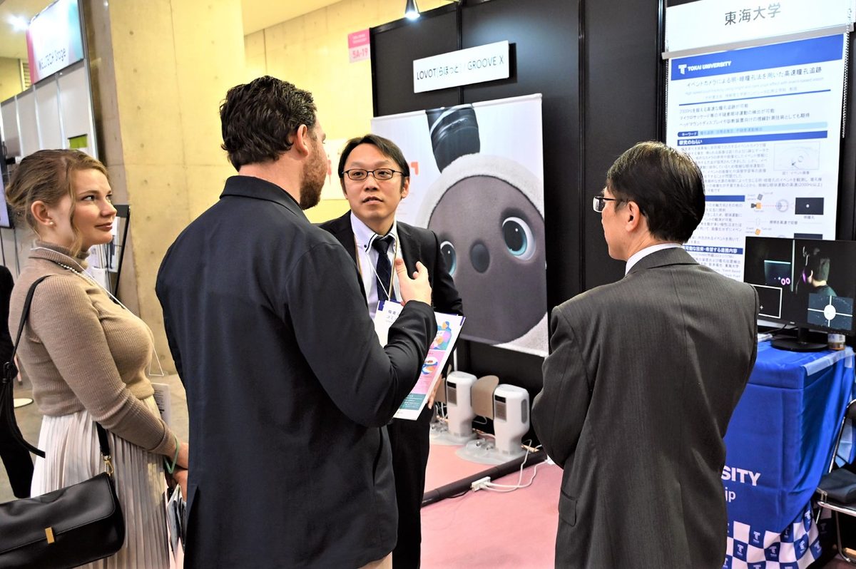 「WELL-BEING TECHNOLOGY2025」には、情報理工学部コンピュータ応用工学科の竹村憲太郎教授が特別出展に参加。「~イベントカメラによる明・暗瞳孔法を用いた高速瞳孔追跡~」と題し、輝度変化を画素毎に非同期で出力するイベントカメラを使った眼球運動の計測について最新の研究成果を紹介しました。これまで、イベントカメラで人の瞳孔を追跡する場合,イベント発生が眼球運動に依存しているため微細な計測は困難とされてきましたが、竹村教授による技術では,能動的な光源の制御によって生じる明・暗瞳孔のイベントを観測して瞳孔を検出。明・暗瞳孔はイベントカメラと相性がよく、イベントの画像化が不要であることから2000Hz以上の高速で、微細な眼球運動の計測を可能とする研究成果について解説しました。竹村教授は、「眼球運動の計測はアメリカの大手IT企業も注目する最先端分野であり、今後も研究を続け市場のニーズに沿ったものづくりにつなげたい」と語ります。会期中は海外からの視察者も多くブースを訪れ、研究成果に関する竹村教授の説明に耳を傾ける姿が見られました。