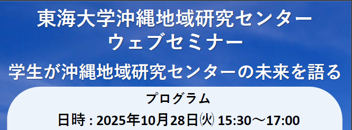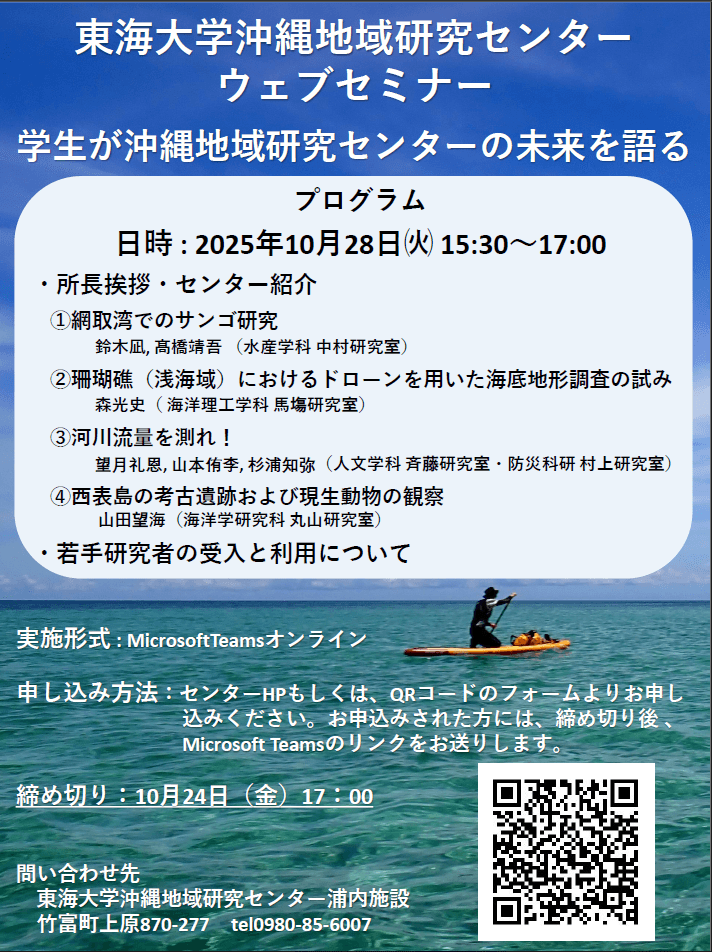 10月28日(火) 沖縄地域研究センター ウェブセミナー「学生が沖縄地域研究センターの未来を語る」2025.10.03 この度、東海大学沖縄地域研究センターでは、「ウェブセミナー・学生が沖縄地域研究センターの未来を語る」を学内・学外の皆様を対象に広く呼び掛け開催することになりました。内容は、本学の学部生と大学院生が、当センターを活用した研究テーマやフィールド実習など、西表島に訪れて取り組んだ活動の報告を企画しています。参加を希望される方は、申込フォームもしくは画像QRからお申込みください。当日は、Microsoft Teamsでご参加いただきます。 申込フォーム