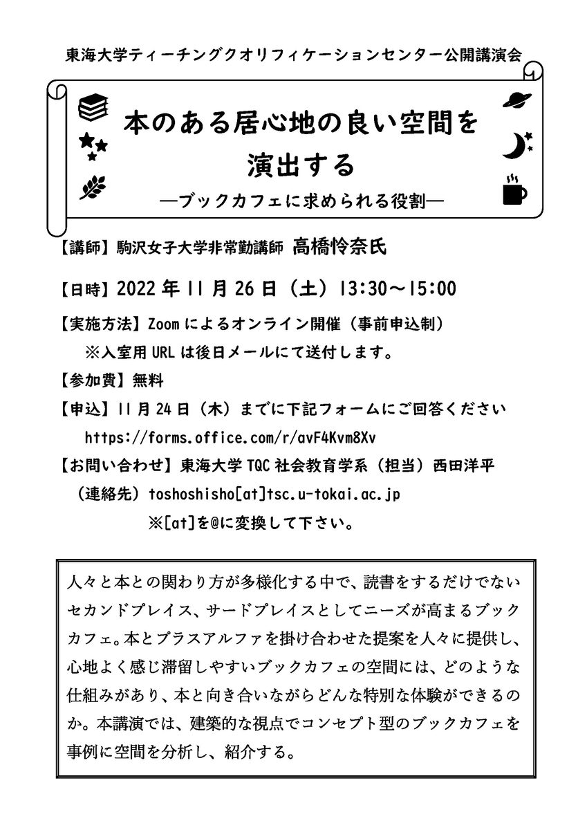 東海大学ティーチングクオリフィケーションセンターでは、オンライン公開講演会「本のある居心地の良い空間を演出する―ブックカフェに求められる役割―」を開催します。