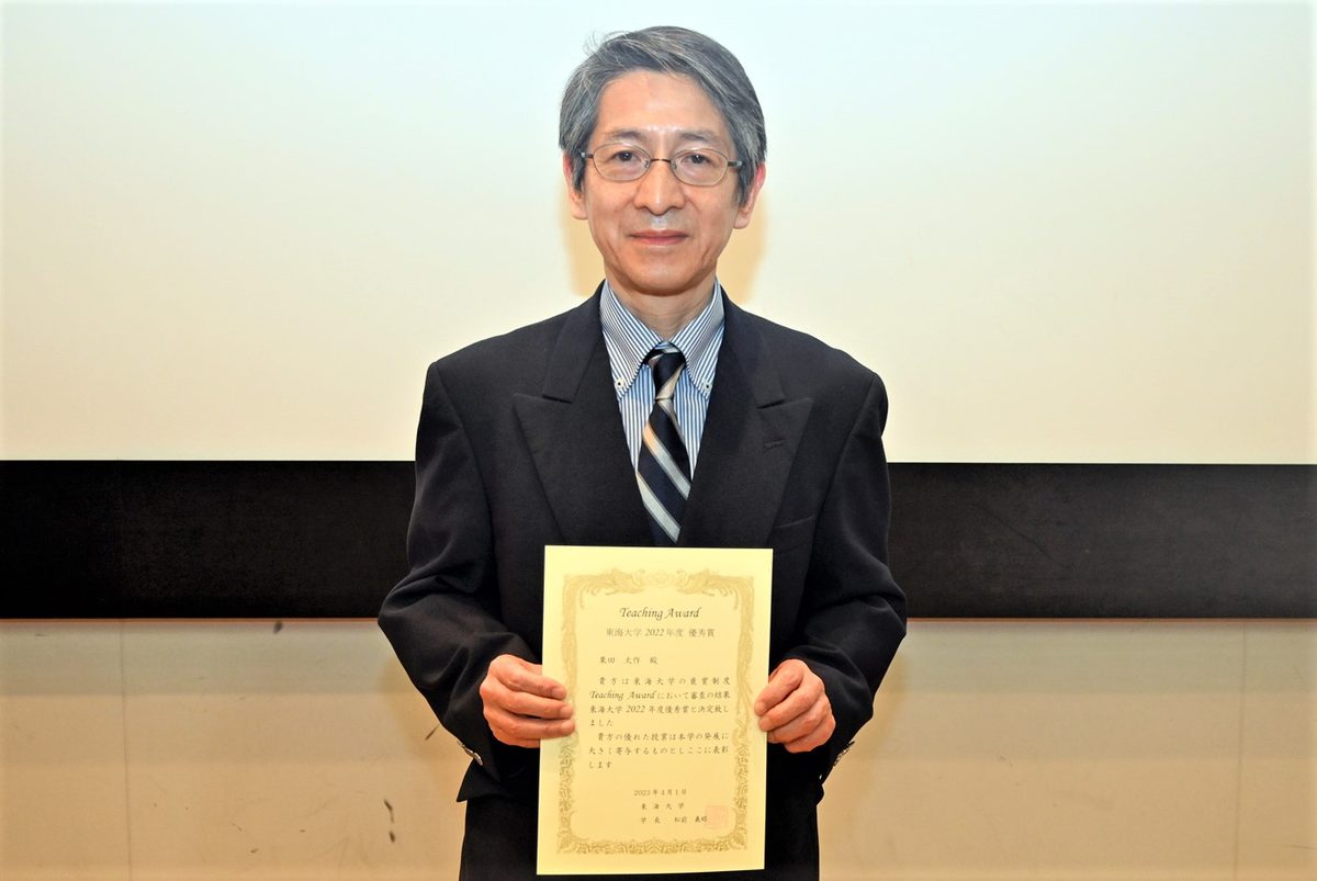 理系教育センターの栗田太作准教授が「2022年度ティーチング・アワード」の優秀賞に選ばれ、4月1日に湘南キャンパスで行われた授賞式で松前義昭学長から賞状と目録が授与されました。本学では教育の質向上を目指し、2002年度から優れた授業を行う教員らを「ティーチング・アワード」として顕彰しています。学生による授業アンケートなどの結果に基づき、ユニバーシティビューローを中心とした厳正な審査を経て学長により決定されるもので、2022年度は5名に優秀賞を授与しました。