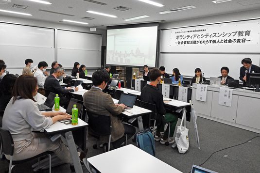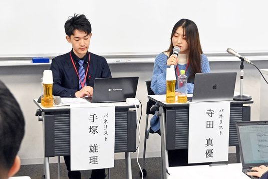 スチューデントアチーブメントセンター・チャレンジプロジェクト「Global Innovation Project(GIP)」の手塚雄理さん(工学部3年次生)と寺田真優さん(文化社会学部3年次生)が、5月13日に早稲田大学早稲田キャンパスで行われた「日本シティズンシップ教育学会」の研究集会で登壇しました。今回は、「ボランティアとシティズンシップ教育~社会貢献活動がもたらす個人と社会の変容~」をテーマに、若者が市民として成熟していく過程について、本学と早稲田大学の教員による基調講演が行われたほか、先進的にボランティアに取り組む両学の学生がパネリストとして登壇して意見を交換。オンラインでの参加者も合わせて約70名が参加しました。