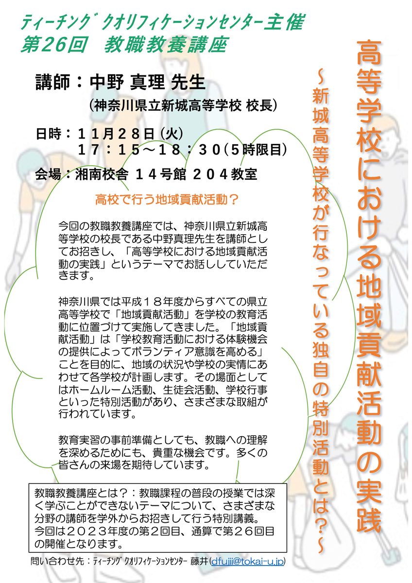 ティーチングクオリフィケーションセンターでは、11月28日(火)17:15より「第26回教職教養講座」を開催します。同講座は、教職を目指している学生の見聞を広めることを目的として、2010年度より実施しています。