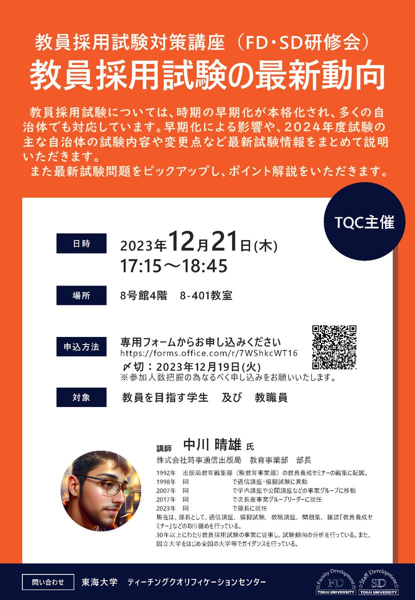 ティーチングクオリフィケーションセンターでは、12月21日(木)17時15分より、教員を目指す学生及び教職員を対象に、教員採用試験対策講座「教員採用試験の最新動向」を開催します。