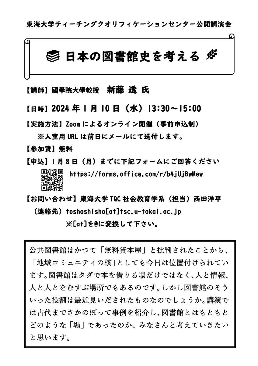 ティーチングクオリフィケーションセンターでは、2024年1月10日(水)13時30分より、オンライン公開講演会「日本の図書館史を考える」を開催します。