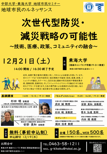 中部大学・東海大学主催の地球市民セミナー「次世代型防災・減災戦略の可能性~技術、医療、政策、コミュニティの融合~」が、12月21日(土)東海大学 湘南キャンパスおよびオンラインで開催されます。