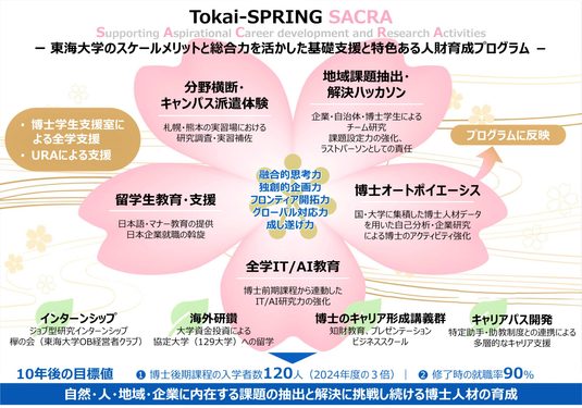 プログラムの策定に携わった大学院総合理工学研究科の喜多理王研究科長(マイクロ・ナノ研究開発センター教授)とURAの荒砂茜准教授は、「国の政策として博士の学位を持ち、社会で活躍できる人材の育成が進んでおり、2040年における人口100万人あたりの博士号取得者数を世界トップレベルに引き上げる(2020年度比で約3倍)という目標が掲げられています。今回採択されたTokai-SPRING SACRAでは、この動きに対応し10年後には、博士後期課程の入学者数を24年度の3倍にあたる120名を目指します。学生たちには、学部や修士課程で自分の基盤となる基礎力と専門性を身につけた上で、桜の花びらと木の幹から広がる葉をイメージしたSACRA(サクラ)のプログラムによって社会で求められる能力を培ってもらいたい」と話しています。