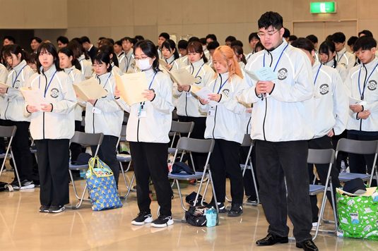 東海大学では2月11日に、静岡市・清水マリンビルで「第54回海外研修航海出港式」を挙行しました。1968年から実施している海外研修航海は、本学の海洋調査研修船「望星丸」(国際総トン数=2174トン)で世界各地を巡り、文化理解・環境問題・協調性の大切さなどを実践的に学ぶ独自の教育プログラムです。今年度は、「Opportunity in Every Wave:変化を舵に君(あなた)の航海へ」をテーマに、静岡市・清水港を出港後、父島(東京都小笠原村)、ポンペイ(ミクロネシア連邦)、コロール(パラオ共和国)に寄港し、3月14日に清水港に帰港する予定です。期間中は、各地のさまざまな文化に触れるフィールドワークなどを行うほか、洋上卒業式といった多彩な船内プログラムにも取り組みます。