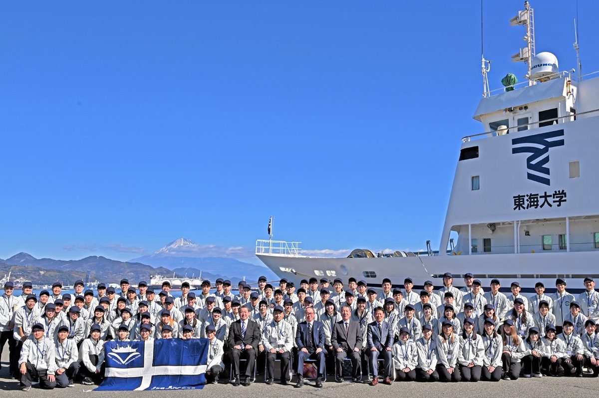 今年度は93名の研修学生と、団役員、乗組員、海洋学部航海工学科航海学専攻の練習学生を合わせた総勢145名が参加。出港式では、松前義昭総長・理事長があいさつに立ち、自身が学生、また団役員として参加した研修航海を振り返り、「大海原で過ごした時間は今でも貴重な体験として記憶に残っています。皆さんにはぜひ、寄港地に住む人々の習慣や文化を感じてもらいたい。自らとの違いを体感すると、人に接する際の考え方も変化するでしょう。発見から得た知識を記憶に留め、自分の人生の糧になるような経験を積んでくれると期待しています」とメッセージを送り、来賓祝辞では静岡市副市長の吉田信博氏が登壇し、研修団を激励しました。