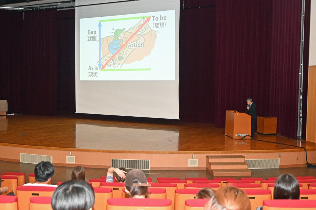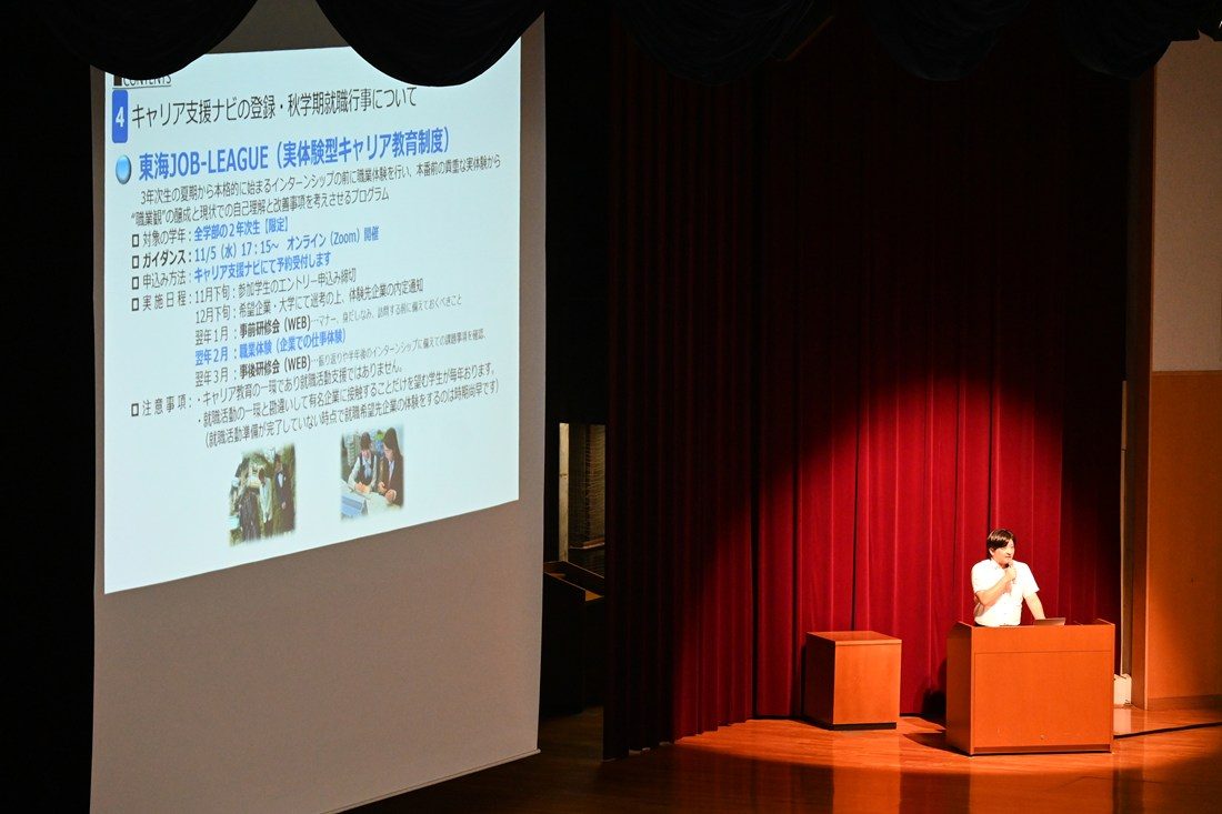 各回とも初めに、CLCキャリア担当の成川忠之部長が登壇し、早期化が進む就職活動において、3年次生の夏に本格化するインターンシップが「就活の入り口」となっていることを説明。「インターンシップの参加申し込みや選考は、おおむね3年次生の春から始まります。2年次生の今の時期から、興味のある業界・仕事の分析や就活で軸にしたいことを考えてみてください」と呼びかけました。さらに、大学院進学のメリットや、理想的な未来を実現するために現在行うべき行動を考える思考法「バックキャスティング」についても説明しました。また、株式会社マイナビと株式会社ワンキャリアの担当者が、自己分析や業界・企業研究に役立つサービスを紹介。CLCキャリア担当の朝賀洋輔課長が、実体験型キャリア教育制度「東海JOB-LEAGUE」や「公務員試験対策講座」など、秋学期開講予定の就活関連行事を案内しました。