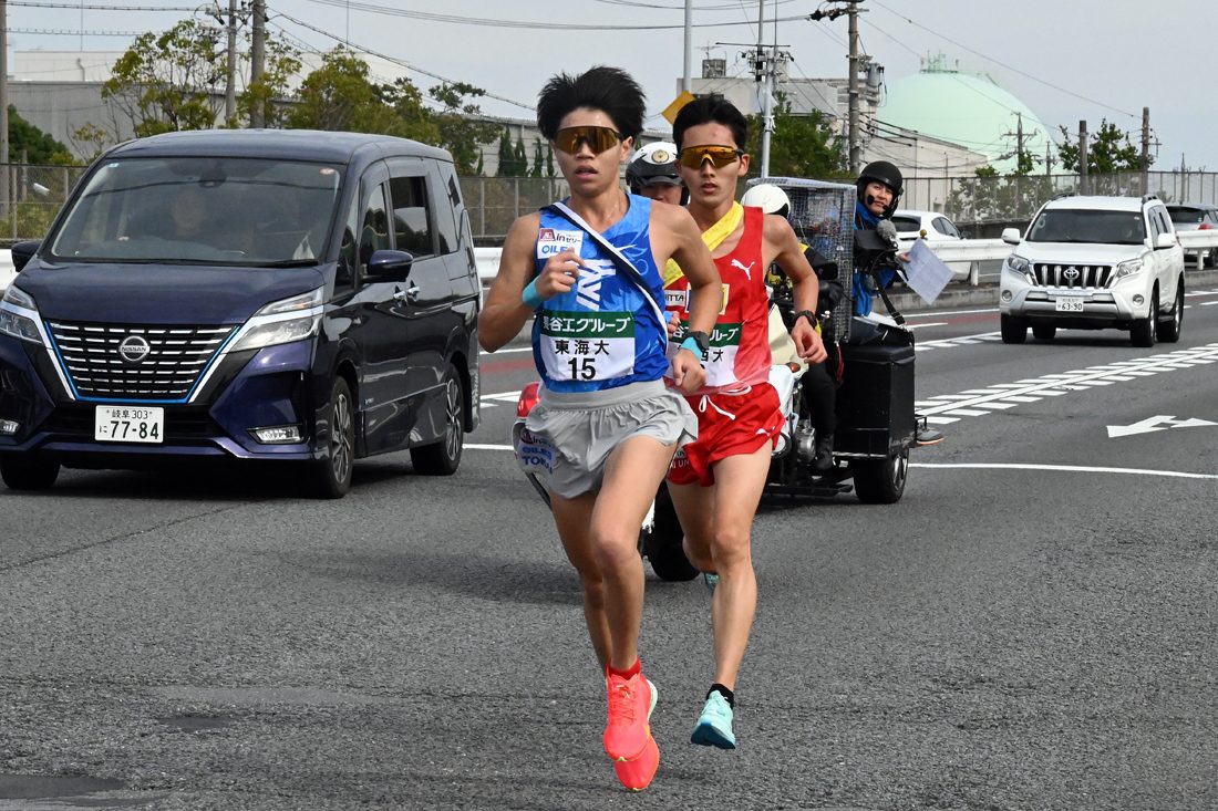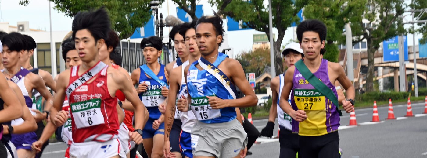 今大会には全国から25大学とオープン参加として日本学連選抜、東海学連選抜の27チームが出場しました。12大会連続38回目の出場となった駅伝チームは、1区の兵藤ジュダ選手(体育学部4年次生)が先頭から35秒差(17位)でタスキをつなぐと、2区の永本脩選手(同3年次生)が前の選手を次々と抜き去り、順位を8つ上げる区間6位の走りを見せました。8位までに与えられる来年度のシード権を目指して9位でスタートした3区の花岡寿哉駅伝主将(情報理工学部4年次生)は青山学院大学に追いつかれたものの、離されることなく共に順天堂大学をかわしました。4区の中野純平選手(体育学部2年次生)は9位をキープ。5区の松山優太選手(同1年次生)、6区の平井璃空選手(同2年次生)が一つずつ順位を落とすも、7区の南坂柚汰選手(同3年次生)が前との差を詰める力走を見せます。最後は竹割真選手(文化社会学部4年次生)が12位でゴールテープを切りました。