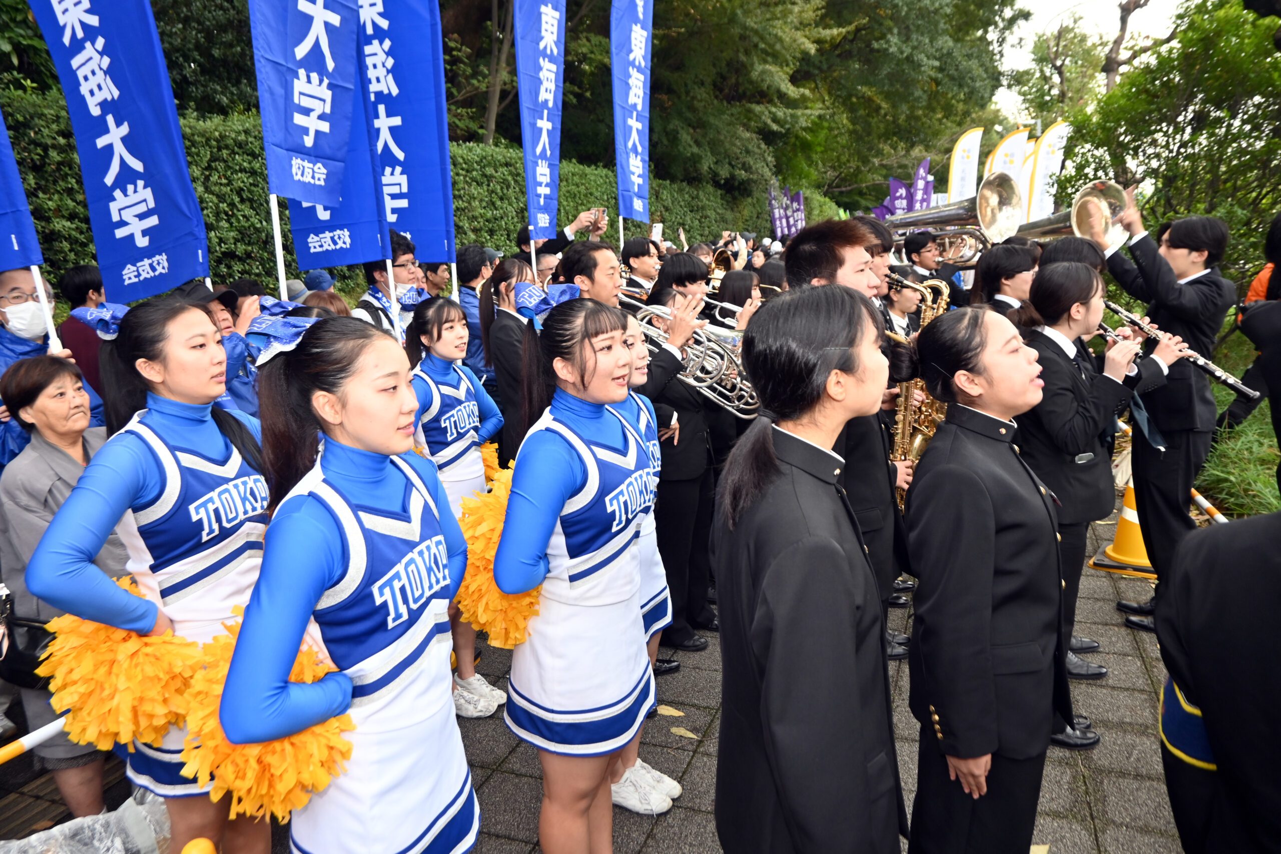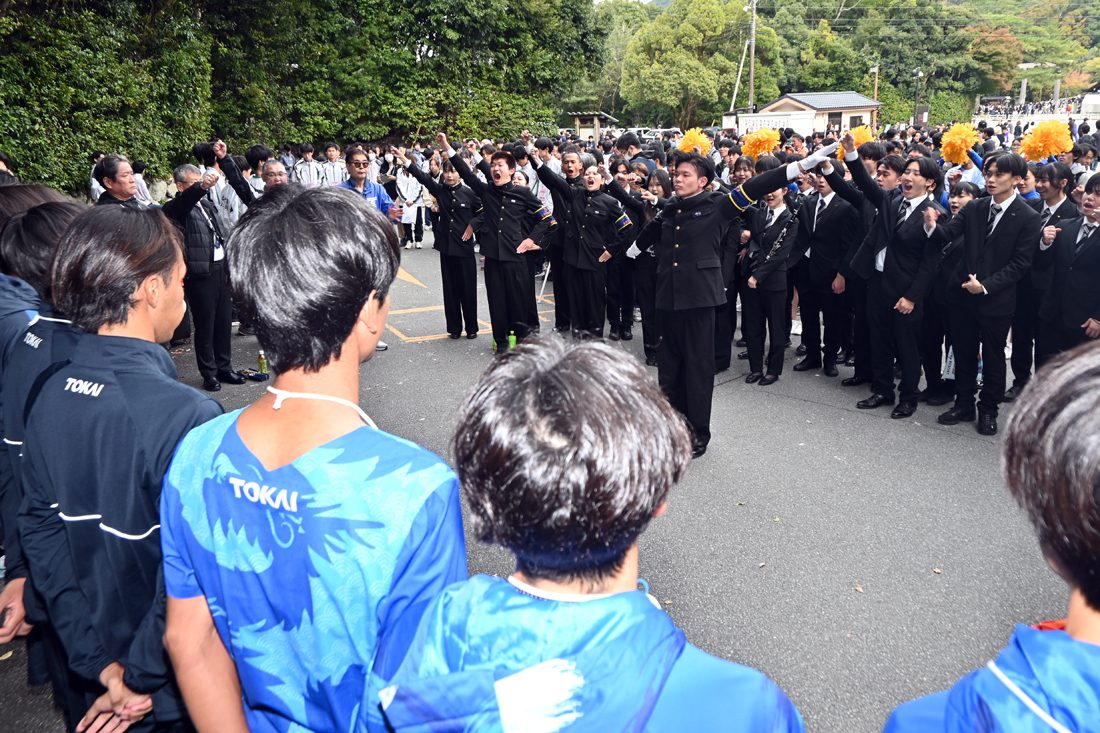 なお、当日は湘南キャンパスの応援団、チアリーディング部、吹奏楽研究会が駆けつけ、スタート・ゴール地点付近の沿道から声援を送りました。レース後、永本選手は、「2区では積極的に前のランナーを追う走りができて手応えも感じました。しかし、チームで目標にしていたシード権獲得には手が届かず悔しさが残る結果になりました。1月の箱根駅伝に向けて、今日出場した選手はもちろん、すべての選手のレベルアップが必要。チーム一丸となって練習に励みたい」と前を向きました。両角速駅伝監督(スポーツプロモーションセンター教授)は、「序盤で流れをつくりたいと考えていましたが、苦しいレース運びになってしまいました。箱根駅伝の予選会から2週間後のレースで、ここまでの疲労が影響した部分もあると思われます」と振り返り、「沿道では多くの学生や大学関係者、校友会員の皆さんが声援を送ってくださいました。チームとして悔しい結果が続いている中でも、温かく背中を押してくださる姿は選手たちにとって大きな励みになっています。箱根駅伝では10位以内に与えられるシード権獲得を目指します。もう一度チームをつくり直し、支えてくださる皆さんに結果で恩返しをしたい」と話しました。