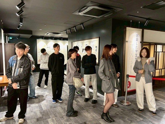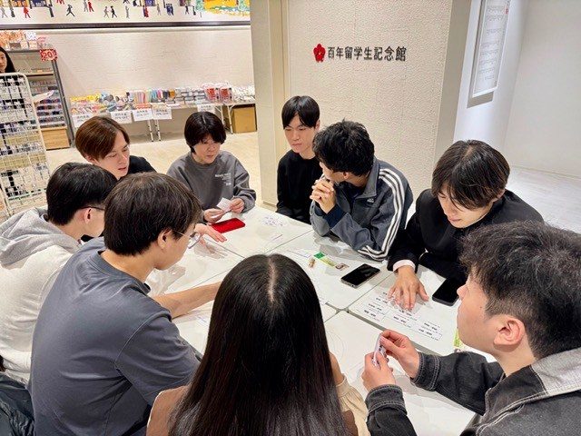 当日は、記念館スタッフの案内で館内の展示を見学し、周恩来をはじめとする100年前の中国からの留学生の歴史や記念館設立の経緯などを学んだ後、CCUのメンバーが作成したオリジナルのカードゲームを実施。中国語の単語が書かれたカードを一人ずつ引き、日本人や中国語圏以外の留学生はその単語を使った例文を、中国人留学生は日本語に訳して例文を考え、7並べのルールでゲームを進め盛り上がりを見せました。CCUの部長教員を務める語学教育センターの森山美紀子教授は、「日常会話では接続詞や助詞が間違ったり抜けてしまったりしても間違いを指摘されることが少ないため、今回のように一語一語考えながら文法的に正しい例文を作るのは難しかったようで、学生たちは互いに教え合いながら取り組んでいました。通常の座学の授業とは異なり、主体的に考えてコミュニケーションを取りながら進めることで、学びを深める機会になったと感じています。中国語を学び始めて日が浅い学生も、周りから助けられたり褒められたりしながら学ぶことで、自信をつけられたようです」と振り返ります。イベントを企画した花さんは、「約100年前に日本に留学した先人たちの歴史を学び、他大学にも輪を広げて交流しながら日中の友好関係を築くことができ、とても意義のある企画になったと思います。参加者一人ひとりが知識と友人を増やすことができた一日になりました。今回は短い時間での交流となったので、今後も機会があれば企画したい」と話していました。