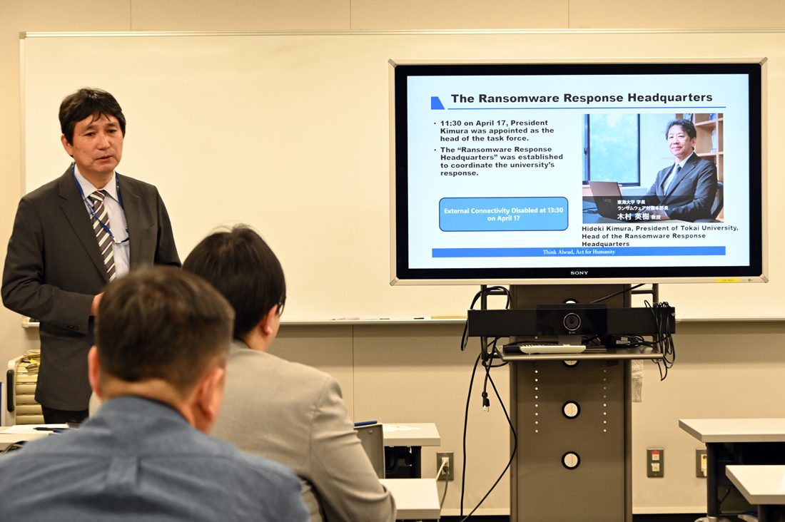 続いて学長室部長(広報担当)で理系教育センターの岡田工教授が東海大学のネットワークについて説明。昨年度まで学長室情報担当の部長を務めていた経験から、本学のネットワークとクラウドデータベースの活用、学生の履修状況や単位取得状況といった情報を統括する「TIPS」や遠隔授業などに活用している授業支援システム「OpenLMS」、学生が自らのPCをキャンパスに持ち込んで学ぶBYODの状況について説明しました。また、今年4月に発生したランサムウェアによるネットワーク障害発生とその対応の経緯について触れ、木村英樹学長を本部長として大学内にランサムウェア対策本部を設置した具体的な対応や今後のサイバーセキュリティのあり方について語り、「大学には国内各地、海外からも学生が集まり、そのPCにはさまざまなソフトウェア、ウイルスが存在していることもあります。そう言った状況における安全性を考えていかなくてはなりません」と強調しました。