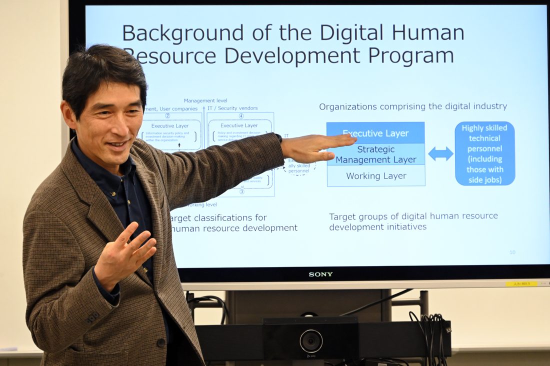 午後には、情報通信学部の三角育夫学部長による講演を実施。初めに品川キャンパスの特徴を紹介し、「本キャンパスは元々、情報通信学部のみが置かれていましたが、2022年度の改組改編で観光、国際、経営、政治経済の4学部加えた5学部の3、4年次生の学生が学ぶキャンパスになりました。学部を超えた知識の融合を図り、より幅の広い視野を持った学生を育成しています。教室もプロジェクトベースの授業が可能なスペースを設けるなど教育効果向上への取り組みを進めています」と説明。さらにデジタル人材の育成に向けた取り組みについて触れ、「来年度に予定しているカリキュラム改訂では、5学部共通でICTやサイバーセキュリティについて学ぶ科目を開設し、戦略的な思考を養う授業としていきます。これからもデジタル化が進む社会で、学生たちが自己実現につながるようなスキルを身に付けてもらう考えです。」と語りました。最後に自らの専門であるサイバーセキュリティについて、「サイバーセキュリティの教育では私は全体のマネジメントを担当し、暗号やネットワークの専門家と共に授業を進めています。
