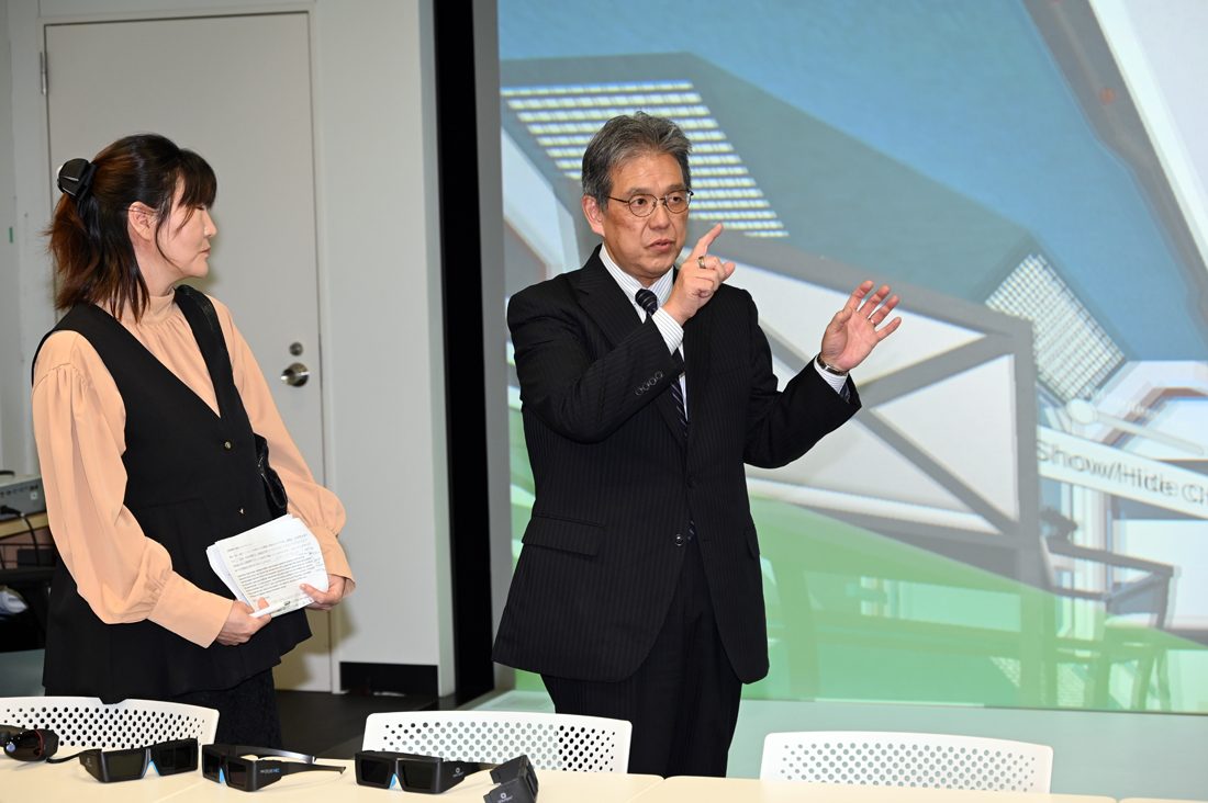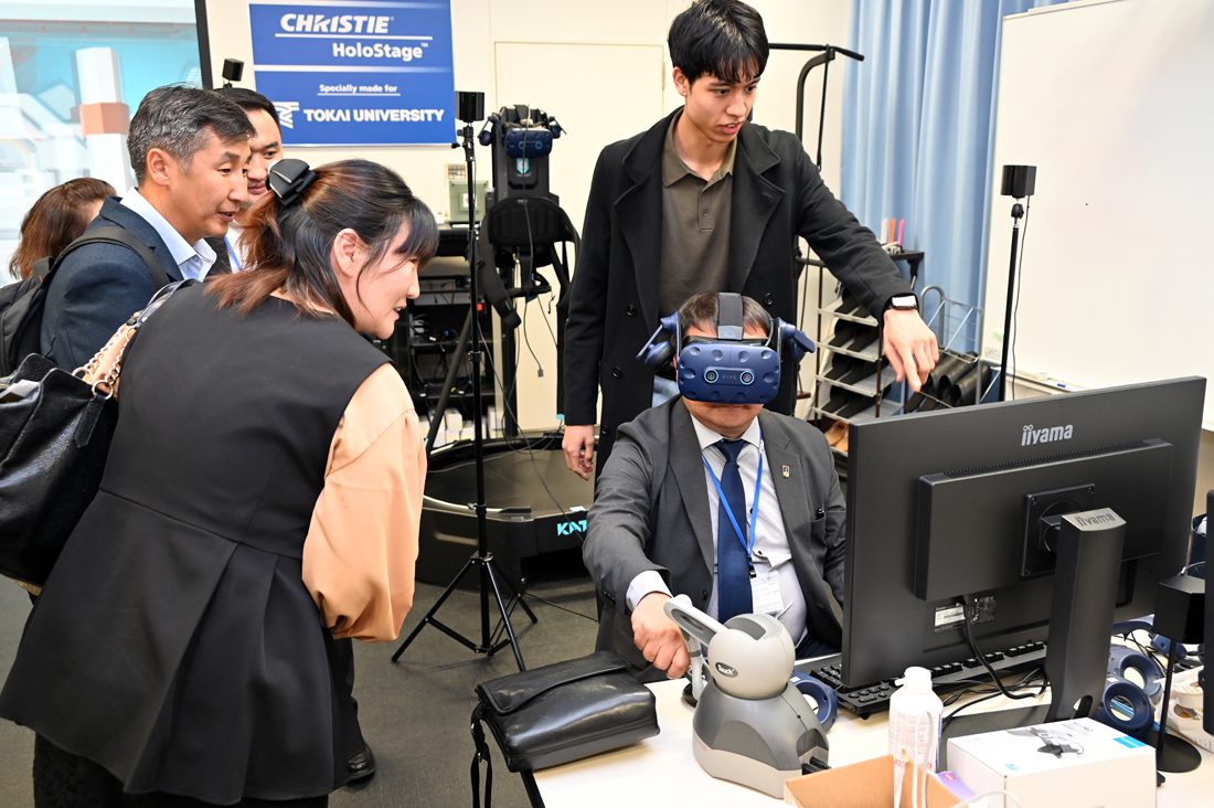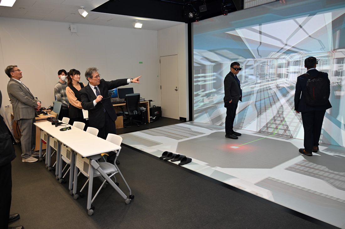 最後に、一行は濱本副学長の案内で品川キャンパス内にある没入型の3次元空間をつくり出す国内でも大型なVRシステム「CAVE」などを設置した「VR実験室」を見学。学生が作成した3次元空間を体験したほか、VR空間での看護師による採血にも挑戦しました。