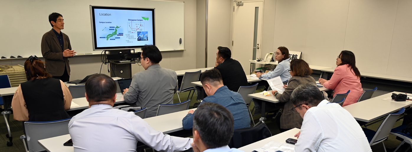 品川キャンパスに10月28日、モンゴル科学技術大学の研修団が来訪しました。日本の大学における教育・研究の現状への理解を深めることを目的としたもので、本学では国際協力機構(JICA)からの依頼を受けて協力しています。