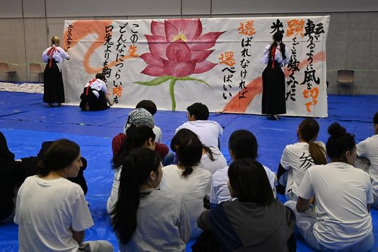 2日目は、前日に続いてプエルトリコ音楽のワークを今度はペアダンスで楽しみ、湘南キャンパスで活動する書道研究会の学生らによるワークショップ、巨大な絵を描くワークなどを実施しました。書道研究会のメンバーがパフォーマンスを披露し、参加者は書道体験やグループに分かれての大きな共同作品制作にも挑戦。同研究会の倉田和奏さん(工学部3年次生)は、「海外の方たちに書道を紹介する絶好の機会。私たちの活動と書道の楽しさを少しでも体験してもらい、多くの学生とも知り合うことができてよかった」と話しました。