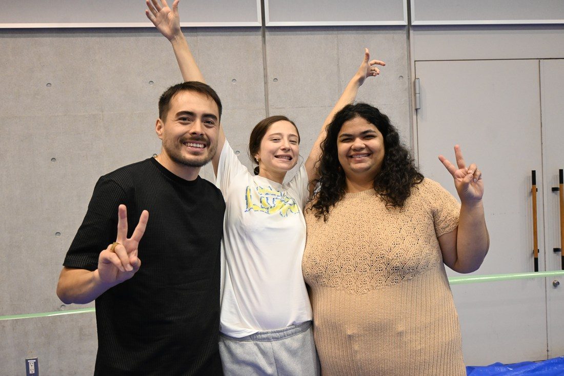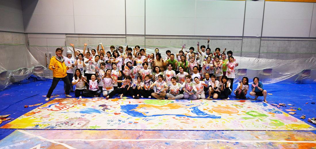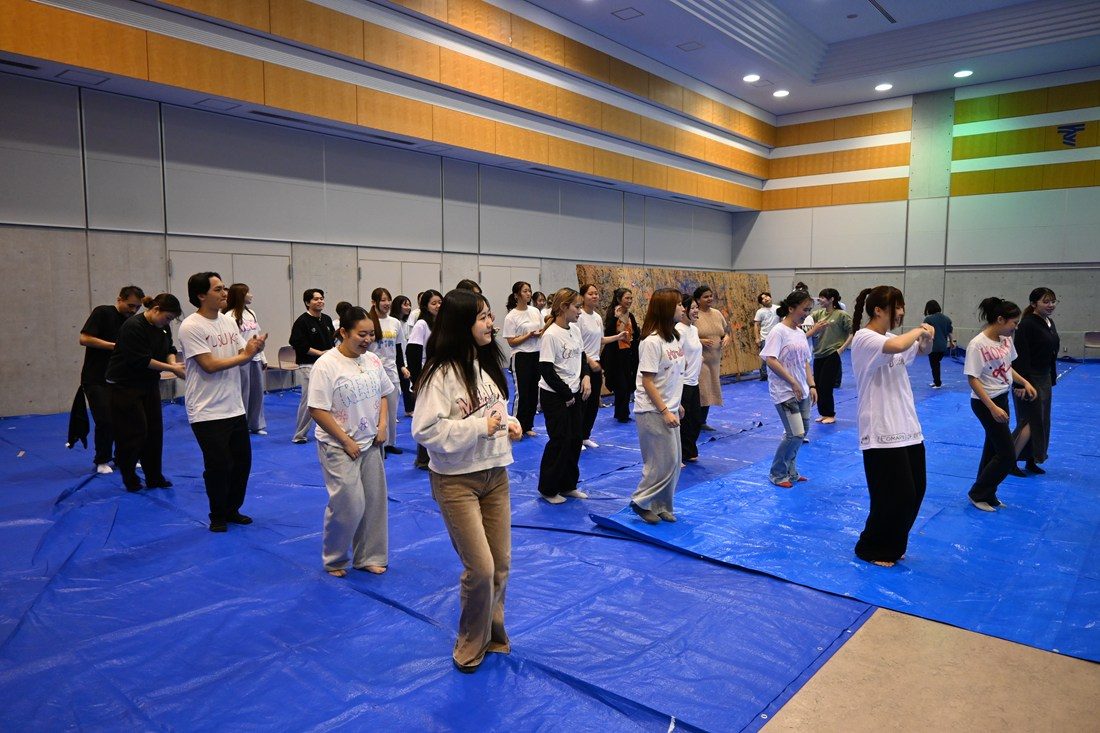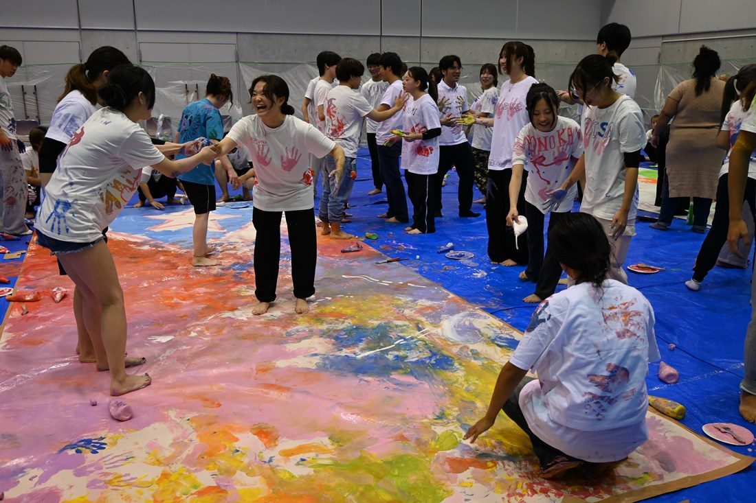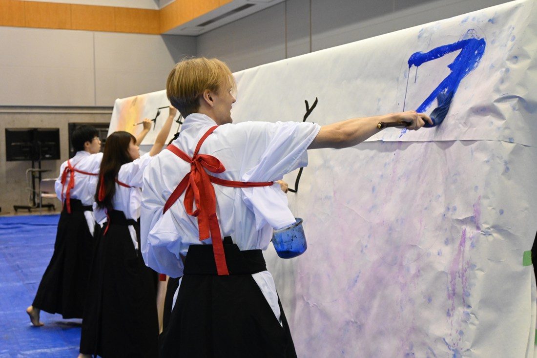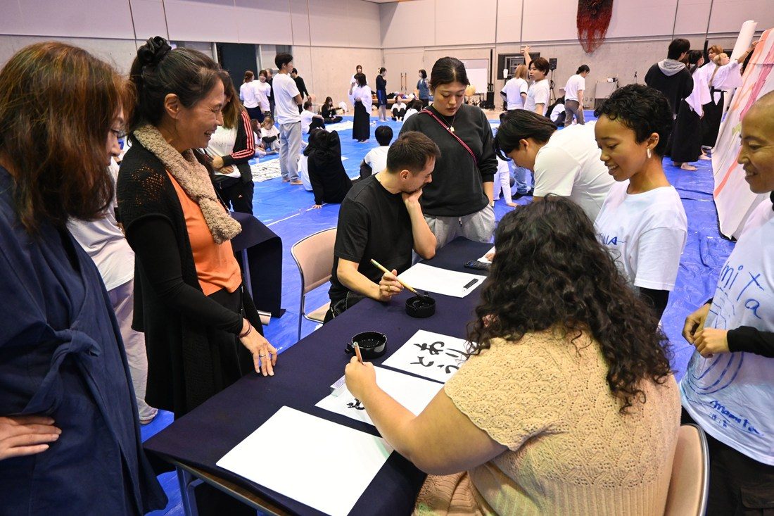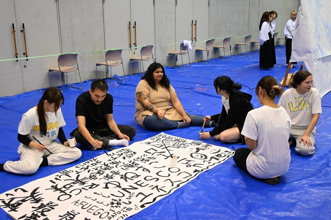 2日目は、前日に続いてプエルトリコ音楽のワークを今度はペアダンスで楽しみ、湘南キャンパスで活動する書道研究会の学生らによるワークショップ、巨大な絵を描くワークなどを実施しました。書道研究会のメンバーがパフォーマンスを披露し、参加者は書道体験やグループに分かれての大きな共同作品制作にも挑戦。同研究会の倉田和奏さん(工学部3年次生)は、「海外の方たちに書道を紹介する絶好の機会。私たちの活動と書道の楽しさを少しでも体験してもらい、多くの学生とも知り合うことができてよかった」と話しました。