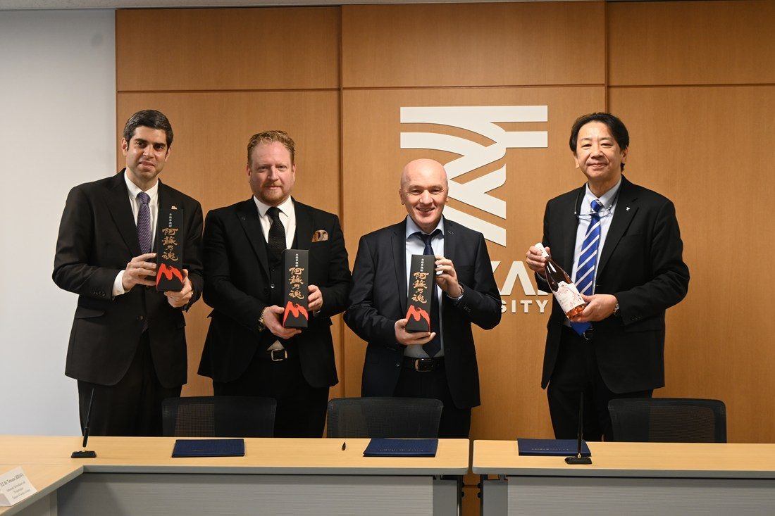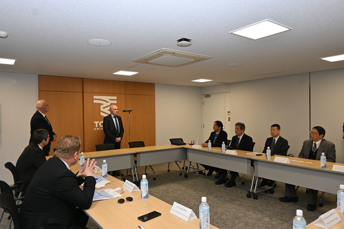 木村英樹学長、SEC担当プロボストの梶田佳孝学長補佐(建築都市学部教授)らとも懇談し、MOU調印式には駐日ジョージア大使館のティムレズ・レジャバ特命全権大使とルスダン・レキシュヴィリ参事官も臨席されました。木村学長はジョージアの歴史や文化、スポーツ好きな国民性などに触れ、「興味や関心に共通点が多い両大学で、交流が深まることを期待します」とあいさつ。クタイシ国際大のトゥラヴァ学長は、「本大学は特に技術系分野で企業との連携を強化しています。MOU締結を機に、企業と活発に連携している東海大学との協力を進めていけるよう願っています」と期待を寄せました。