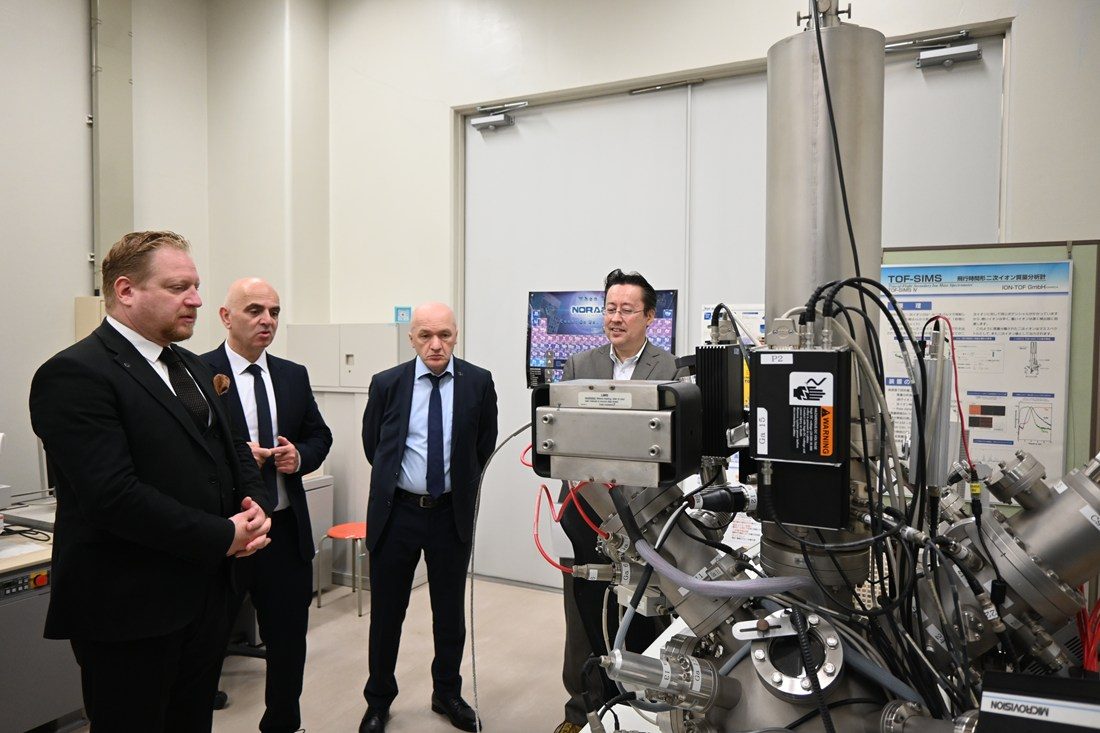 11月5日にはクタイシ国際大学のトゥラヴァ・パァタ学長、ツァガレーリ・ヴァフタング博士、ピピア・ギオルギー博士が湘南キャンパスを訪問。高雄教授の案内でキャンパス内を見学したほか、工学部や情報理工学部の研究室で教員らと懇談。技術共同管理室では、内田ヘルムート貴大准教授(工学部)が設備や機材、それらを使って進められる研究などについて紹介、尾内敏彦教授(総合科学技術研究所)が「起業関連活動」をテーマに本学の取り組みについて説明しました。