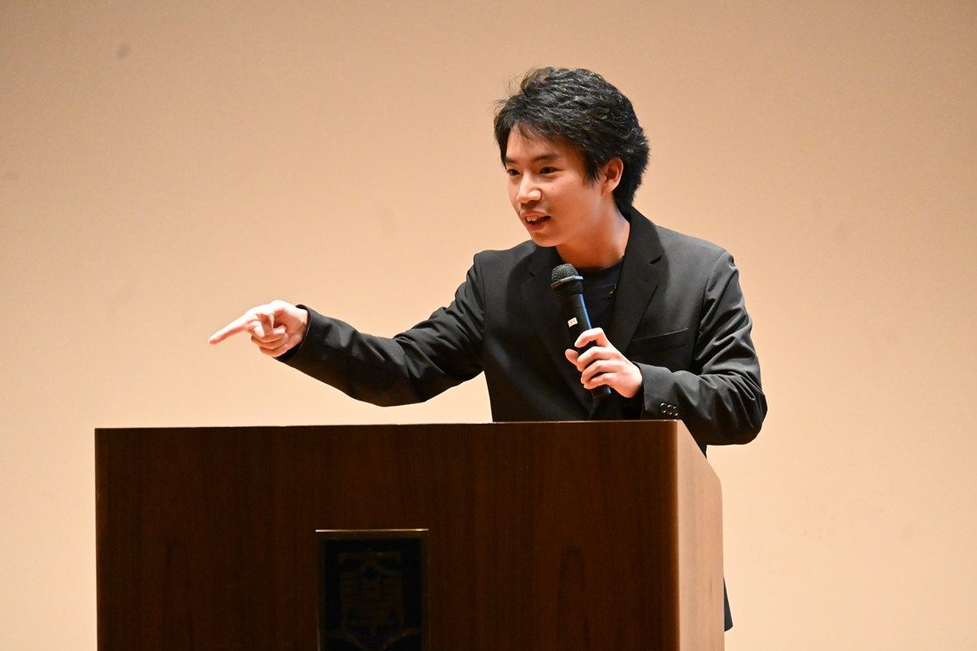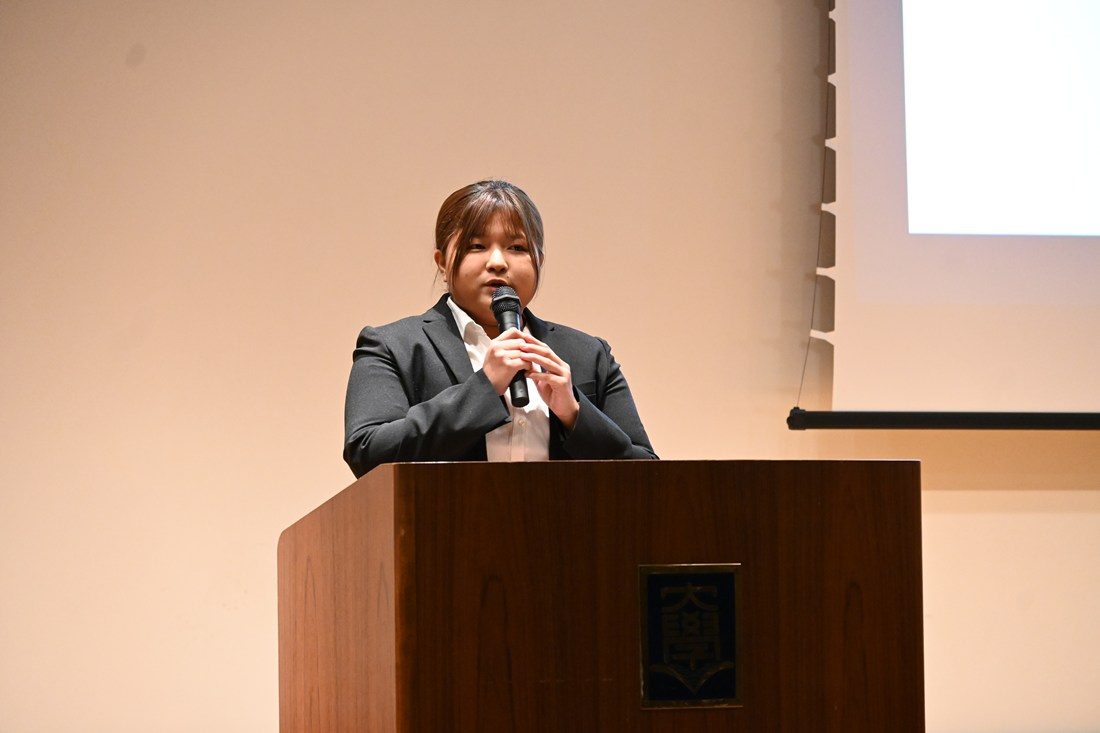 審査の結果、最優秀賞に選ばれたのは、「チャンスは貯金できないよ」をテーマにスピーチしたインドネシア出身のヴィンセント・ダッレンさん(建築都市学部土木工学科4年次生)です。ダッレンさんは冒頭、「貯金はいいことですか、それとも悪いことですか?」と問いかけ、「必ずしも貯金はいいとは限りません。貯金は悪いときもあります」と意表を突く言葉で聴衆を引き付けました。自身が1年次生のときに思い立った沖縄訪問を先延ばしにしているうちに4年次生になり、研究に明け暮れる中で未だに実現していないと振り返り、「チャンスを貯金してしまったら、いつか引き出す時には後悔しかない。一期一会を意識して、自分にとって貴重なチャンスが訪れたら、貯金せずにすぐ使ってください」と終始、軽妙な語り口でスピーチしました。