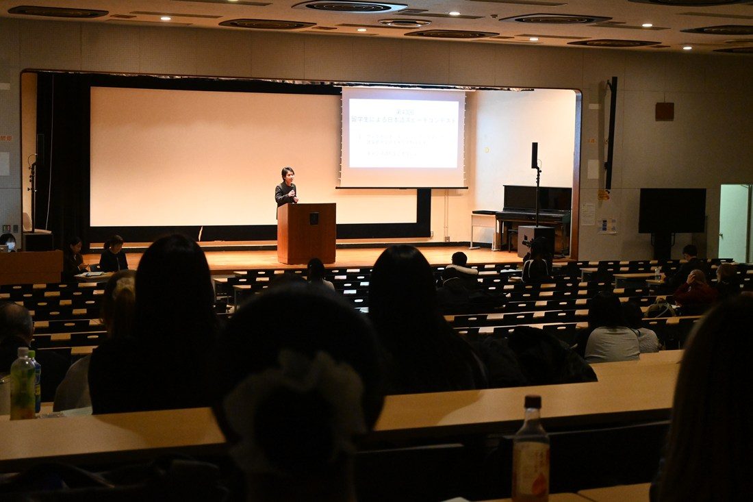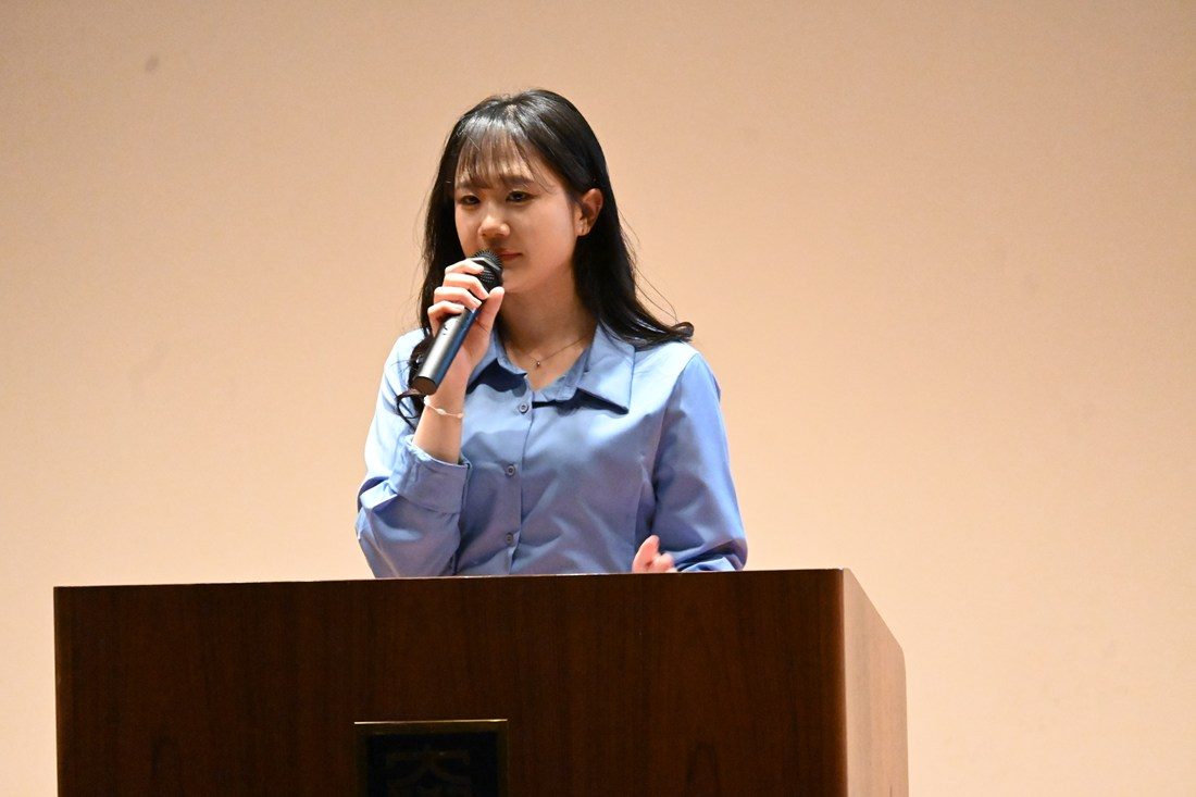 当日は、学生や教職員ら約50名が聴講しました。出場者はそれぞれにテーマを設定し、5分以内で発表。審査委員長は本センターの田口香奈恵教授(留学生支援教育学系)、審査員はチャールズ・コワルスキー准教授(英語教育学系・主任)、学生代表として宇納百恵さん(大学院文学研究科日本文学専攻日本語教育学コース博士課程前期2年次生)、原琴菜さん(国際学部国際学科4年次生)が務めました。審査は「言語的表現」「非言語的表現」「内容」「構成」「全体の印象」の5つの観点に加え、日本語の上手さのみならず内容の深さや全体の印象も大きなポイントとして評価されました。